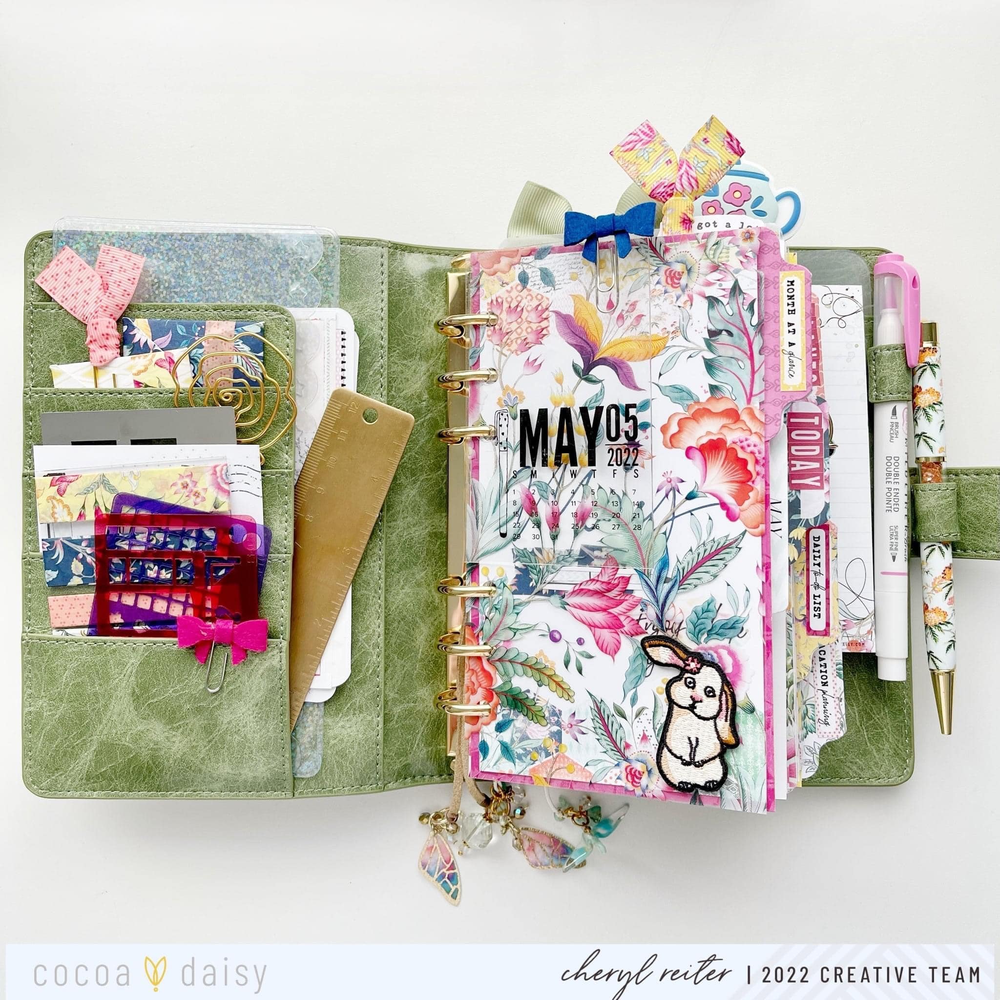 First I trimmed the stunning floral acetate from the Afternoon Tea Classified: Planner Kit to page size and added the adorable embroidered bunny from last month to the bottom right-hand corner. I then placed it at the beginning of my planner just before the “May” dashboard. I used the Afternoon Tea Planner Dashboard kit in the Personal Planner size by cutting the dashboard down by 1/4 inch on all sides and adhering to a pretty piece of cardstock. I finished them up with a few embellishments!