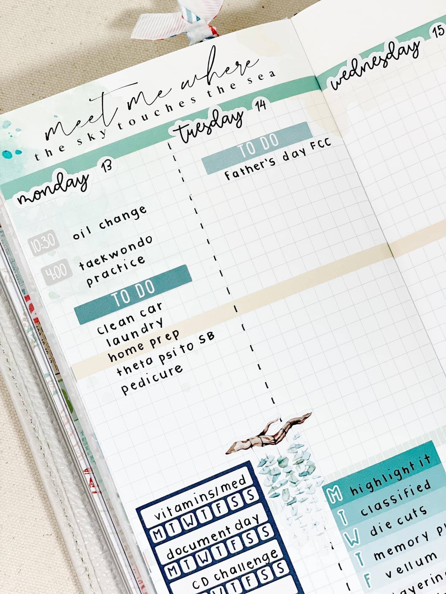 On the back of a dashboard, I created a tip-in with the “soaking up some summer sunshine” from the Wayfarer Modern Memory Keeping Kit and the light house washi tape from the Wayfarer Planner Kit. The 5 Double-Sided Week-On-One-Page Pages are where I list my gratitude/thanks for each day.