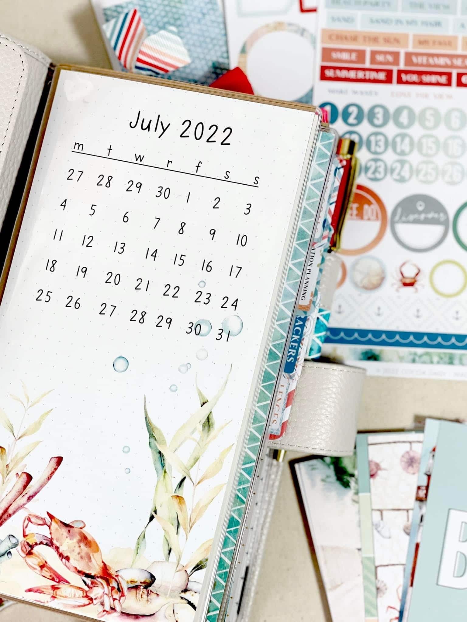 This month, I created a FREE calendar for my opening section; I downloaded the Wayfarer Planner Printable, printed it out, then ran it back through the printer with a calendar I typed up for July. Now, when I open my planner, I have a quick, at a glance, page (that’s pretty too!).