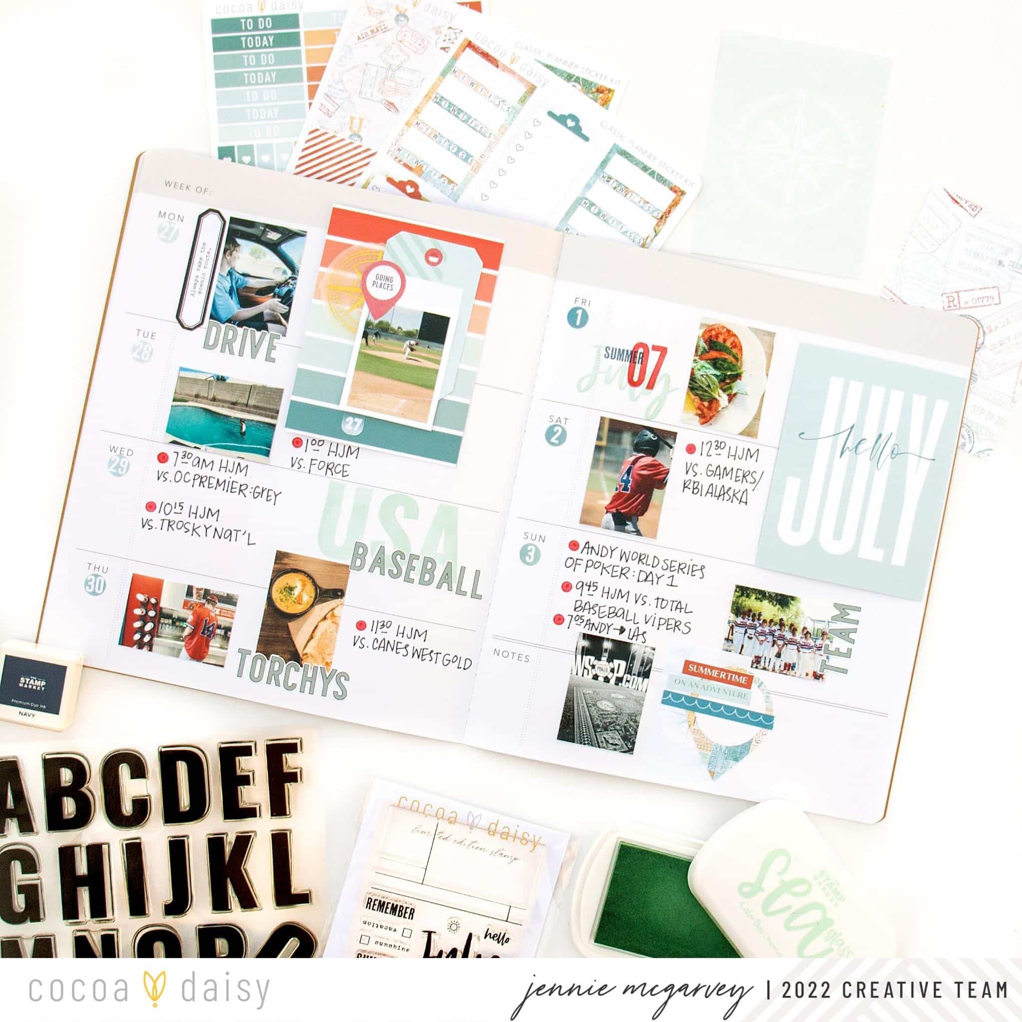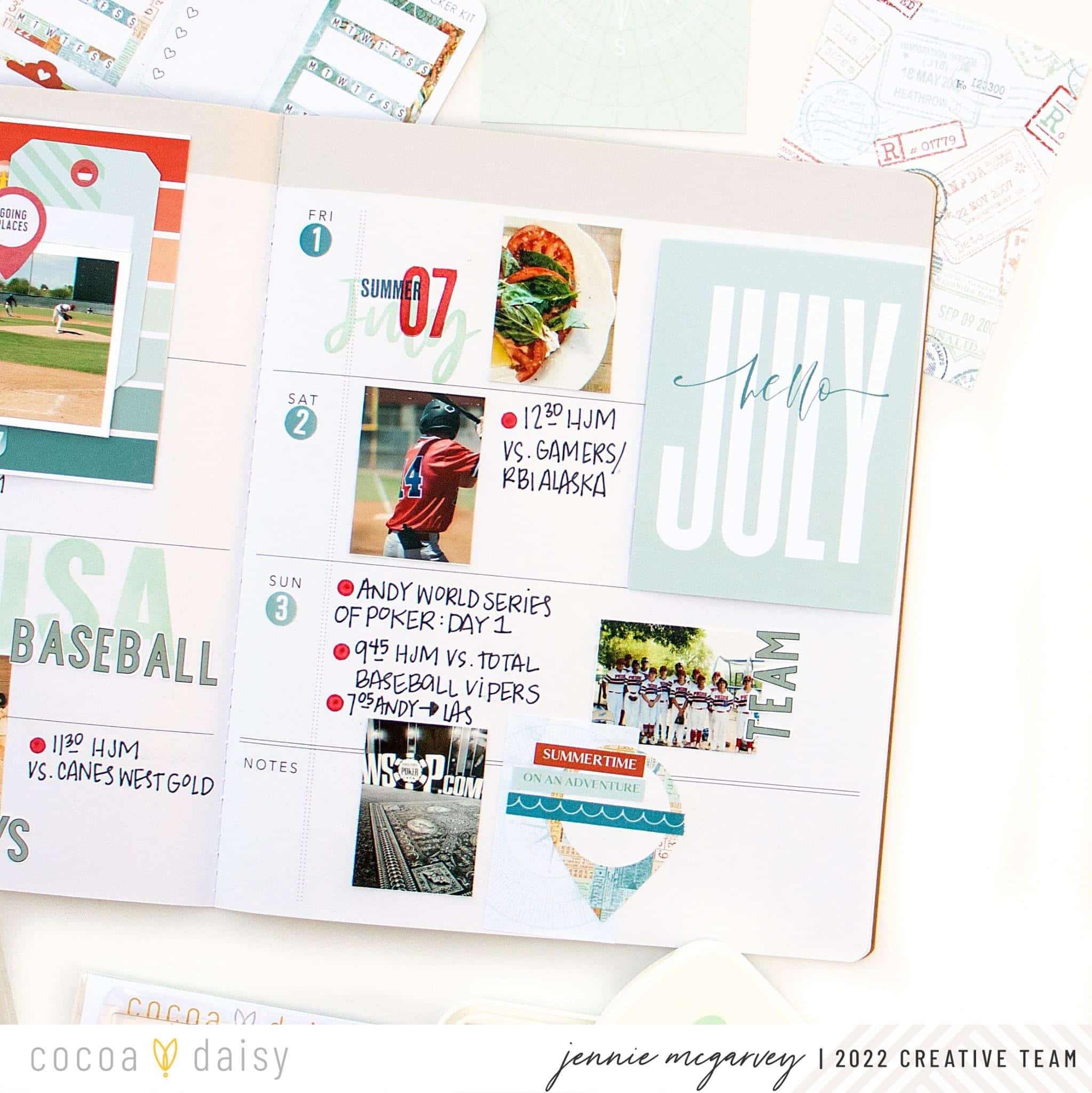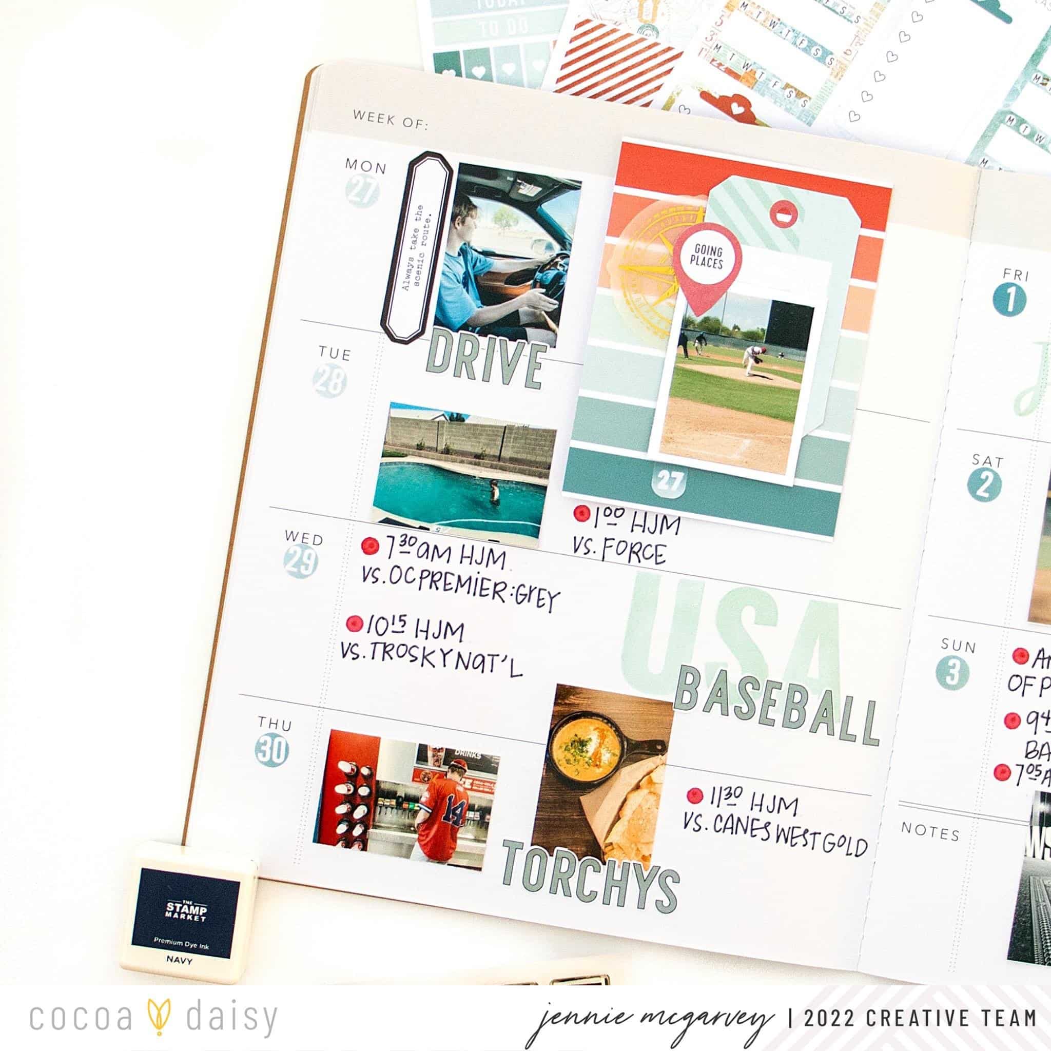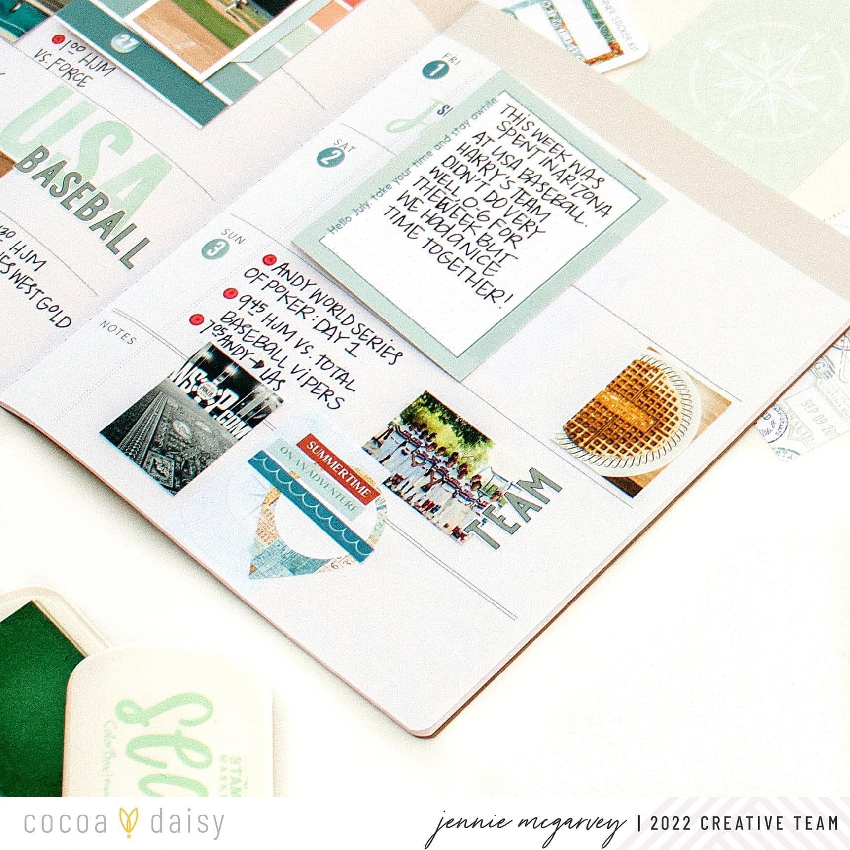 This week was dedicated to traveling to a baseball tournament called USA Baseball. Obviously, there was a lot of red, white, and blue involved throughout the week, so I decided to use those colors throughout my layout, with a twist. I chose to use dark blue + aqua primarily with the red.