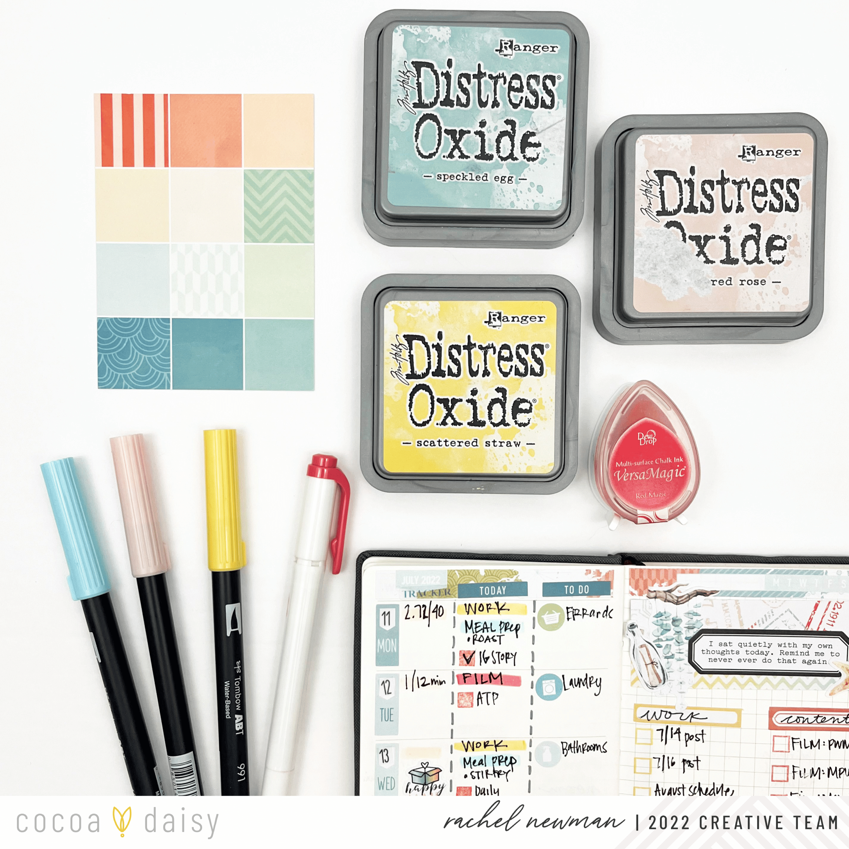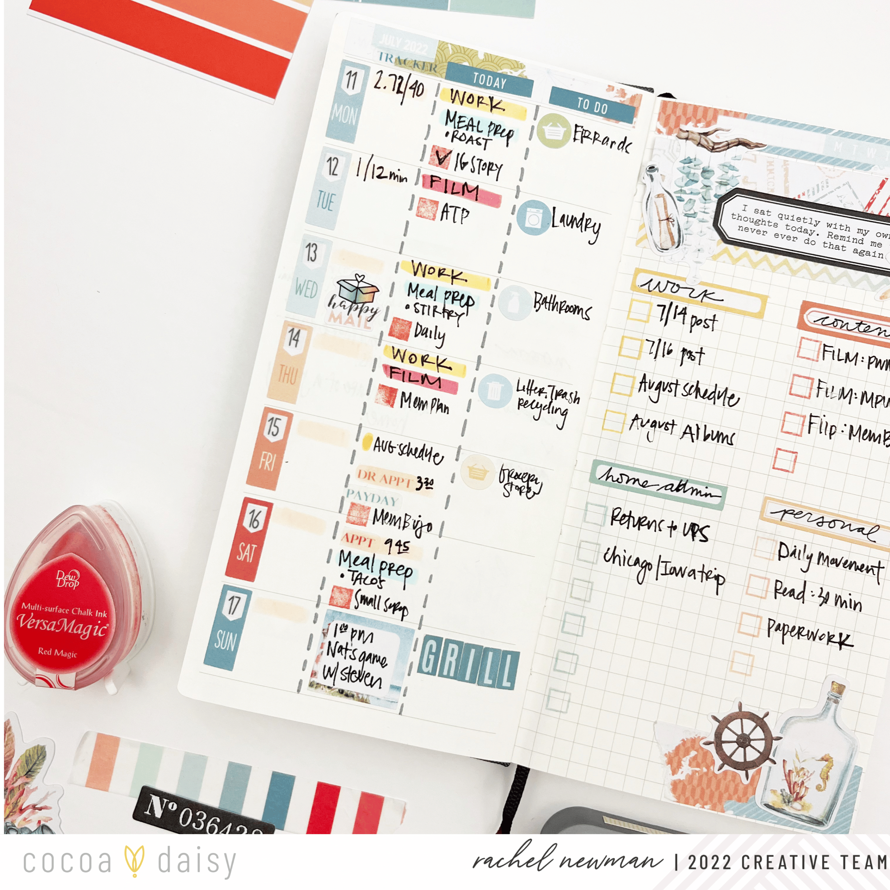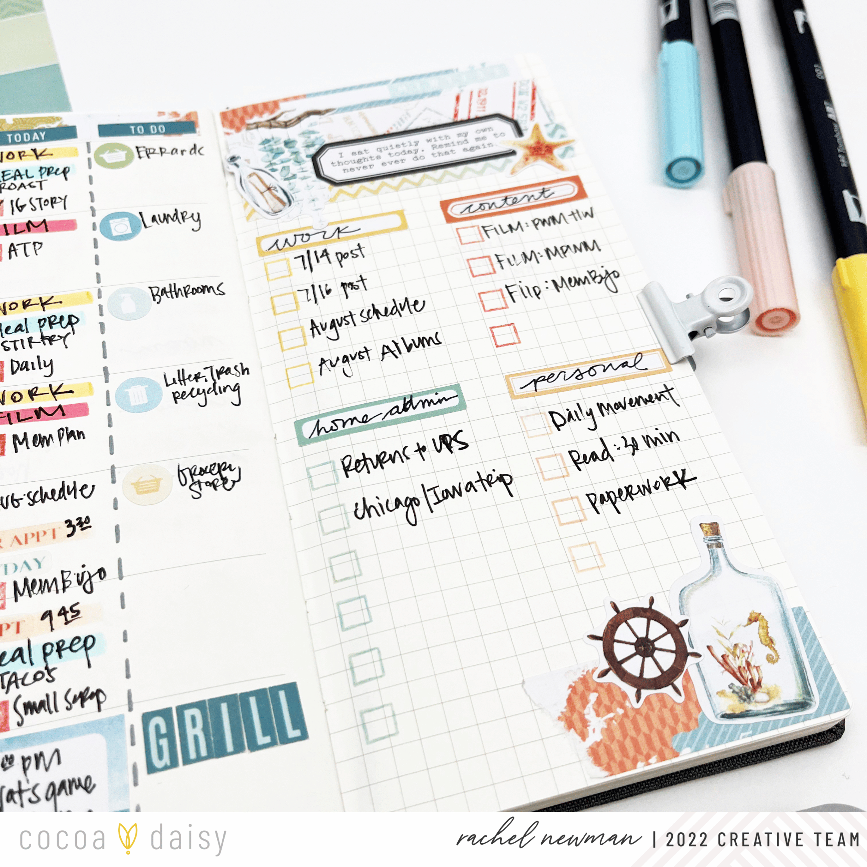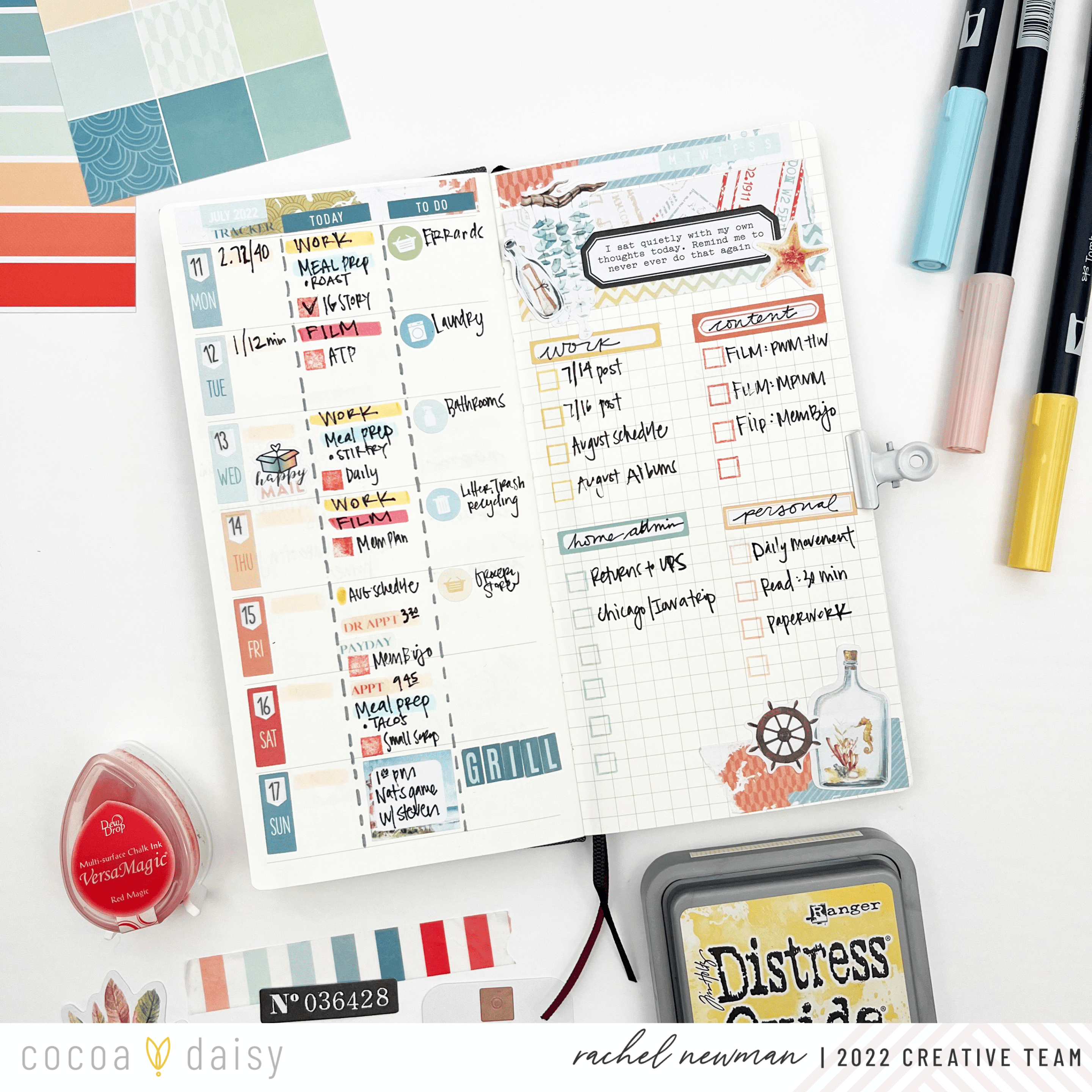 The Wayfarer Collection was easy to match with my favorite inks and brush pens. One way I color match is with the color block card found in the Wayfarer Planner Add-On Kit. This one card is probably my favorite part of the whole kit. I typically have four things I’m color coding: Blue for Home/Admin, Yellow for Work, Red or Orange for Content, and Pink for Personal. Almost every collection has these tones, it is just a matter of finding the right hue. Sometimes, it is not a perfect match and that is OK.