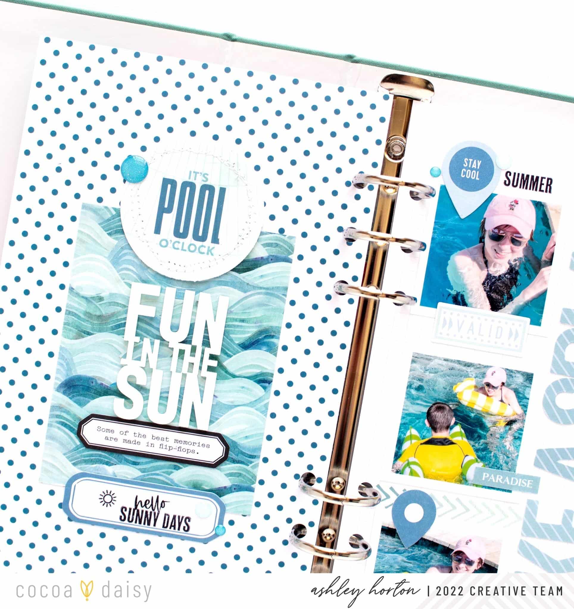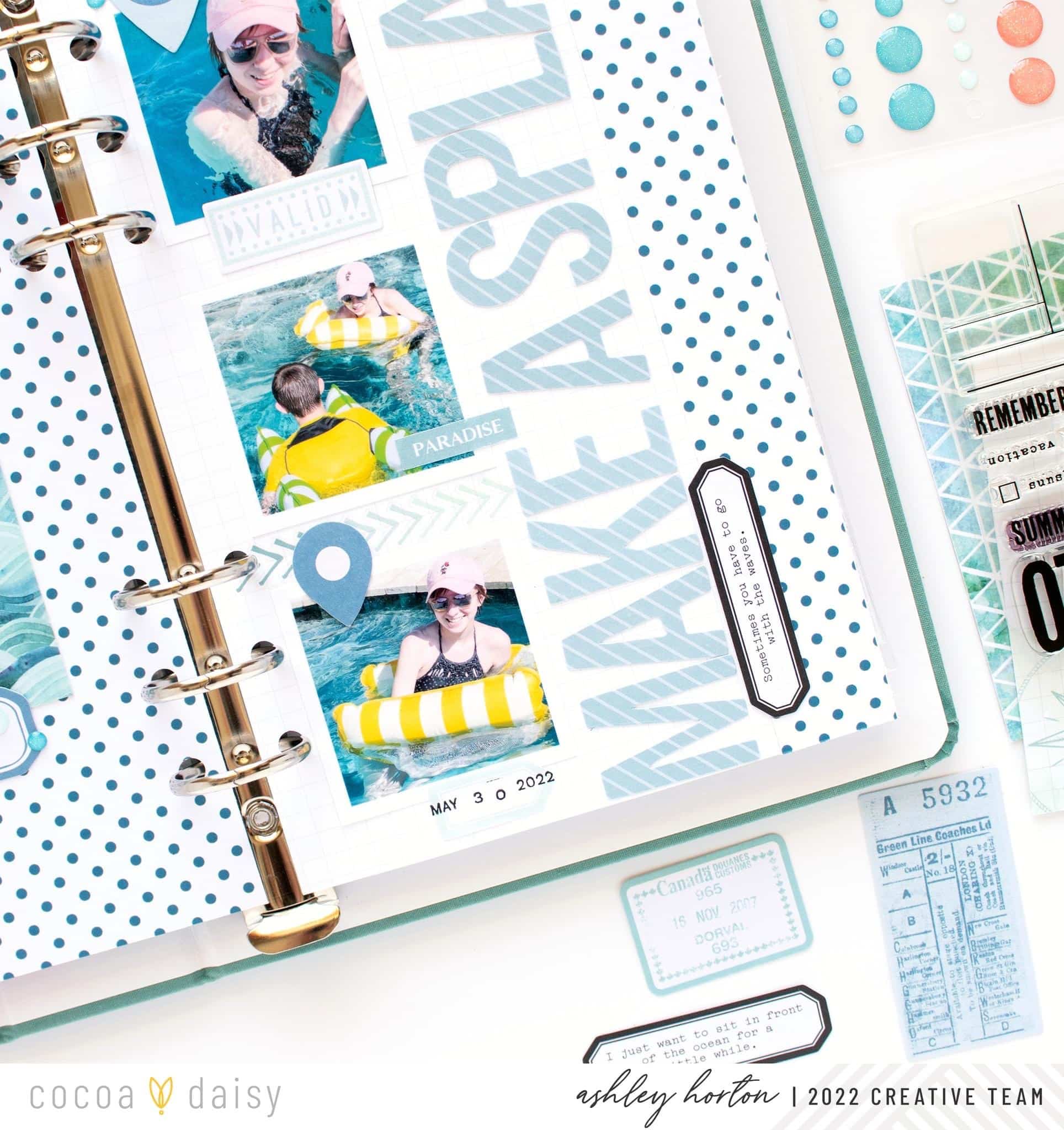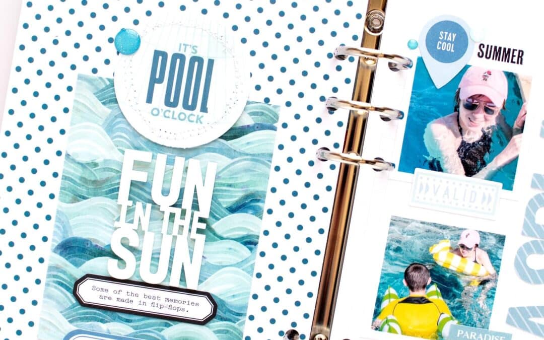 I used shades of blue for this TN layout, with products from the Wayfarer Modern Memory Keeping Kit, Wayfarer Memory Keeping Sticker Kit, and Wayfarer Traveler’s Notebook Memory Keeping Kit. I knew that a blue color scheme would go great with pool photos, and I chose a mix of ephemera, rub-ons, alphas, stickers, and a journaling card to build my layout.