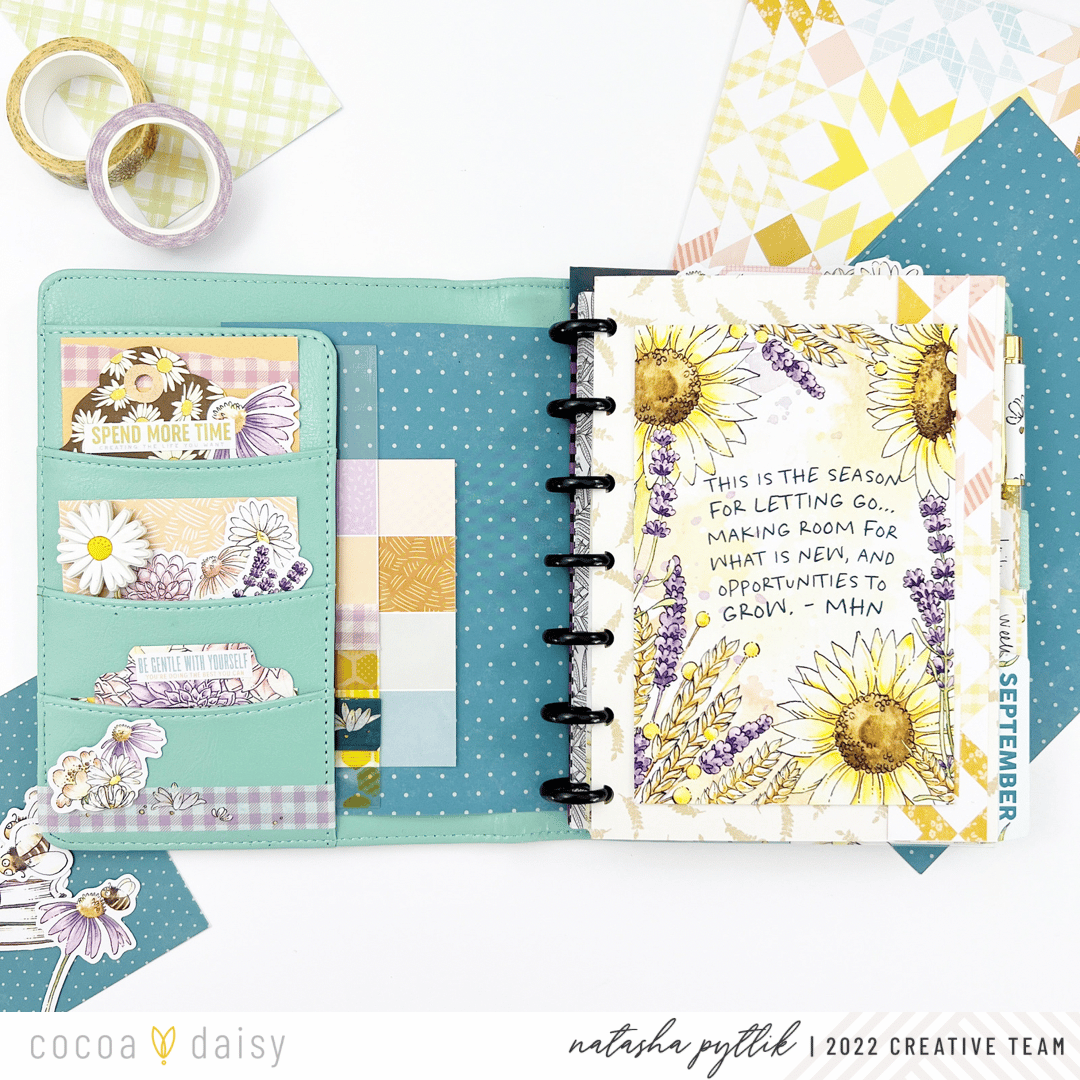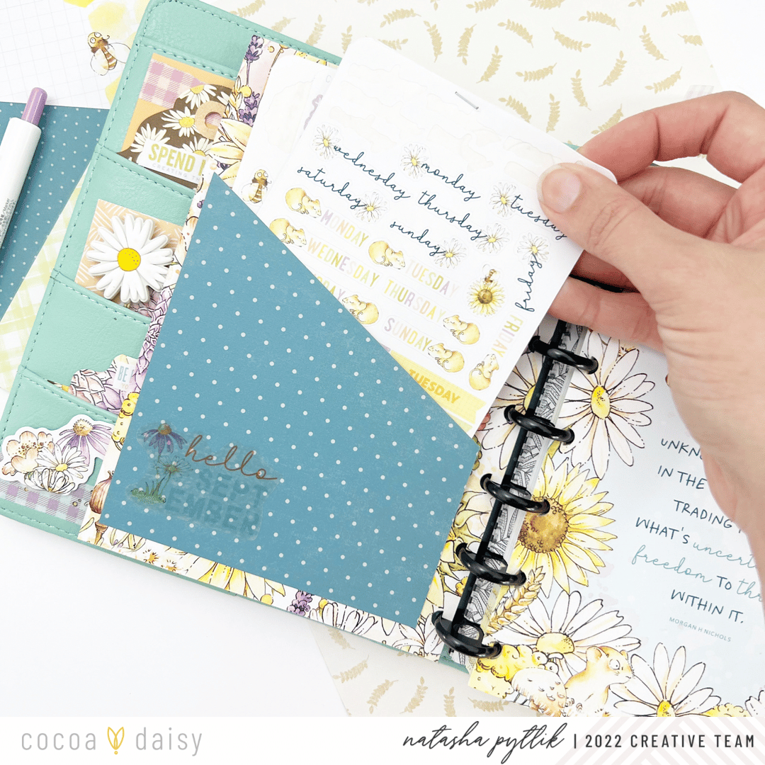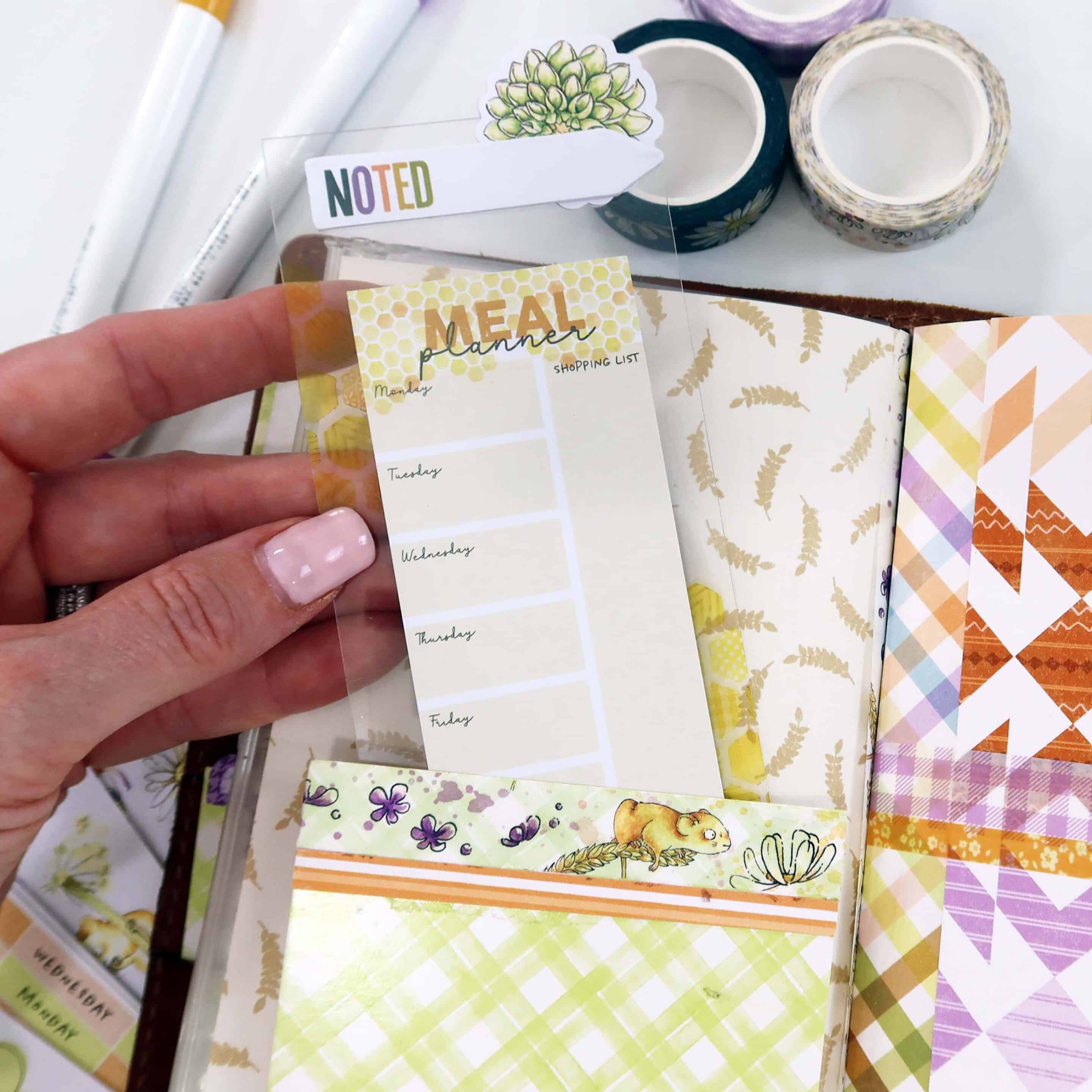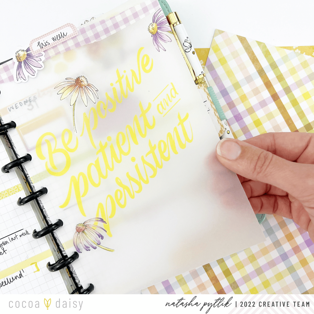 I loved finding ways to incorporate pieces from the Daisy Fields Planner Kit into my setup, especially ones where I wouldn’t cut or transform into something else. I place them front and center in my planner for a functional, yet decorative way. This month we’ve received a clear acetate on which to place the meal planner sticky notepad on.