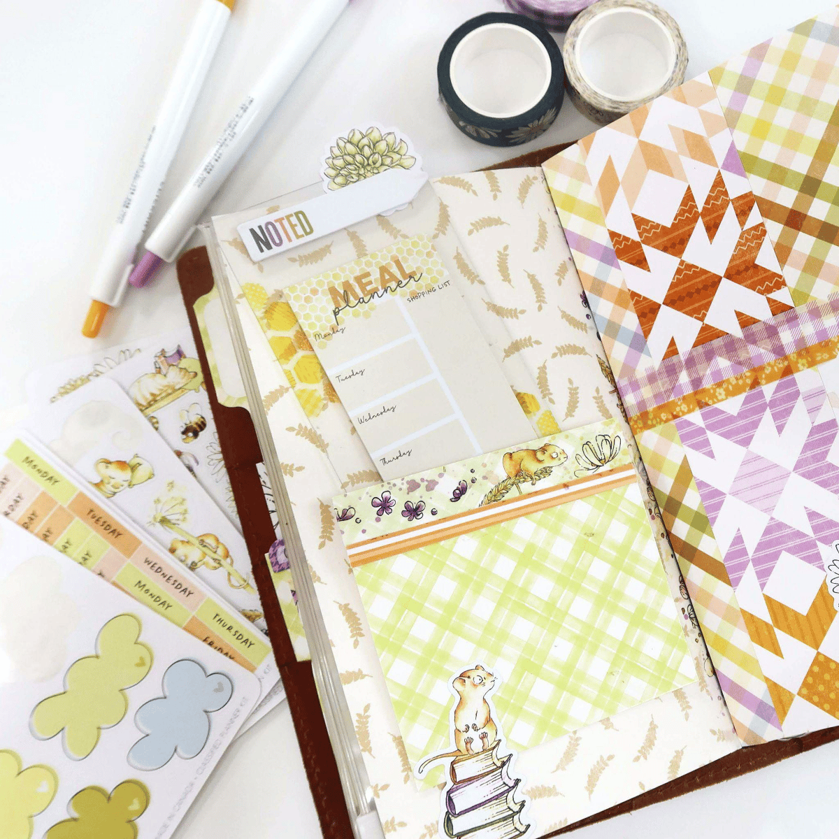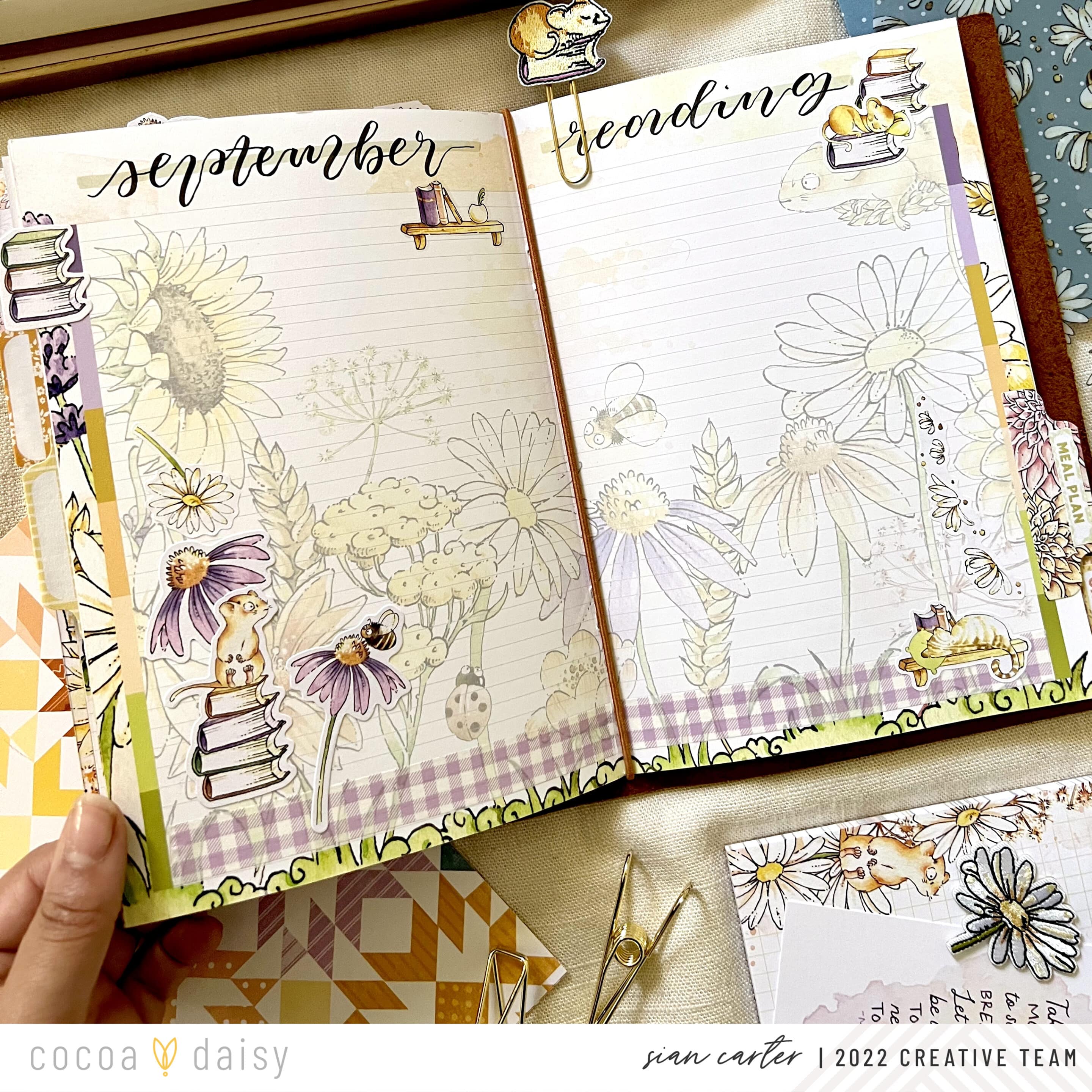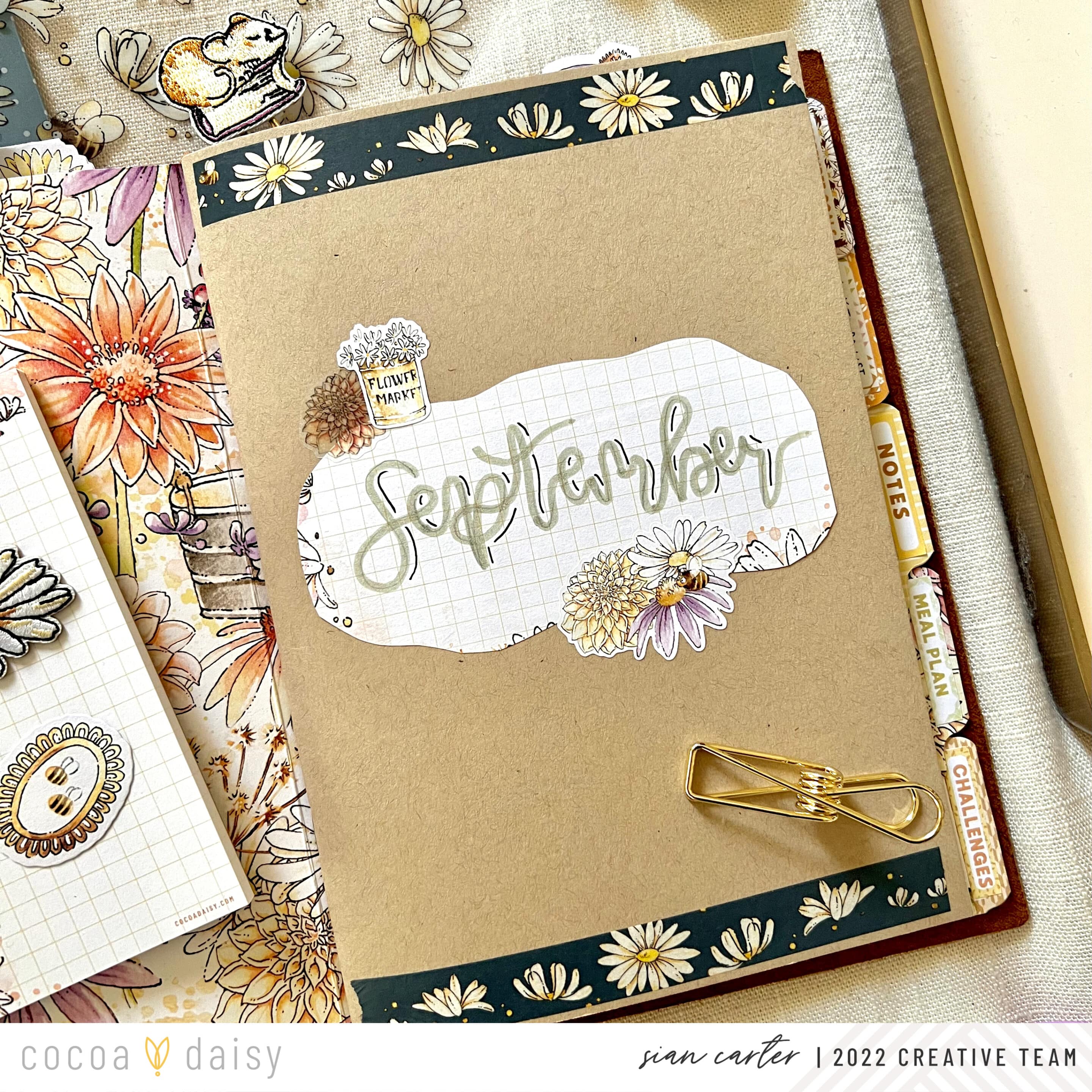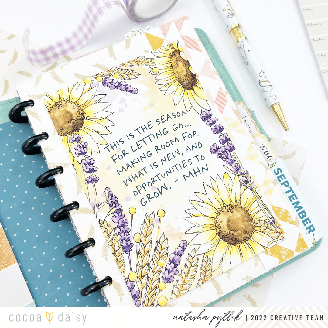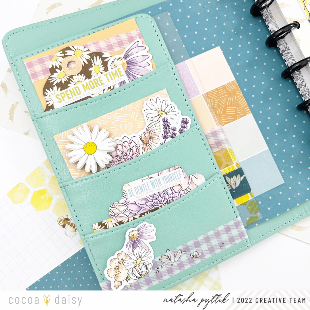 I loved finding ways to incorporate pieces from the Daisy Fields Planner Kit into my setup, especially ones where I wouldn’t cut or transform into something else. I place them front and center in my planner for a functional, yet decorative way. This month we’ve received a clear acetate on which to place the meal planner sticky notepad on.