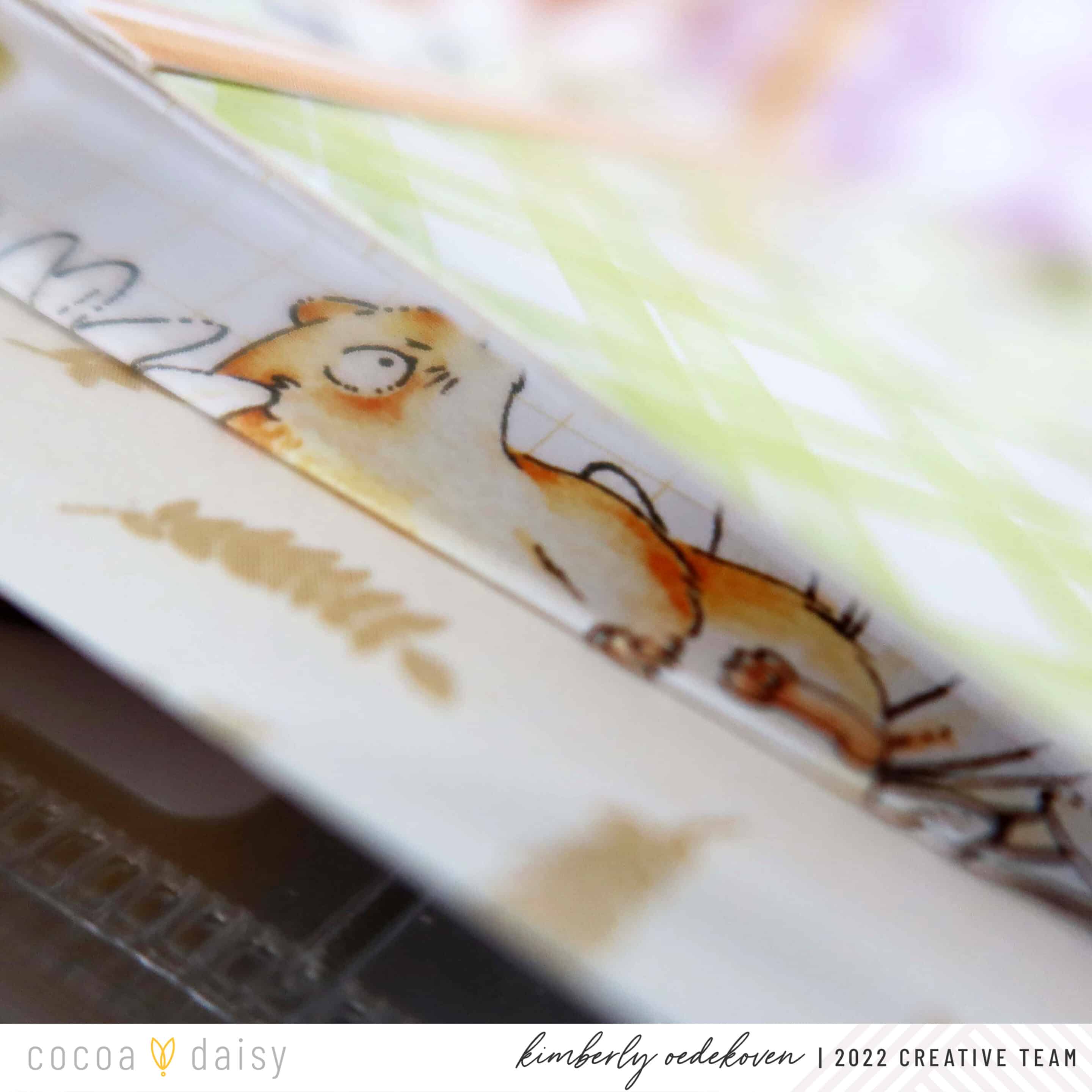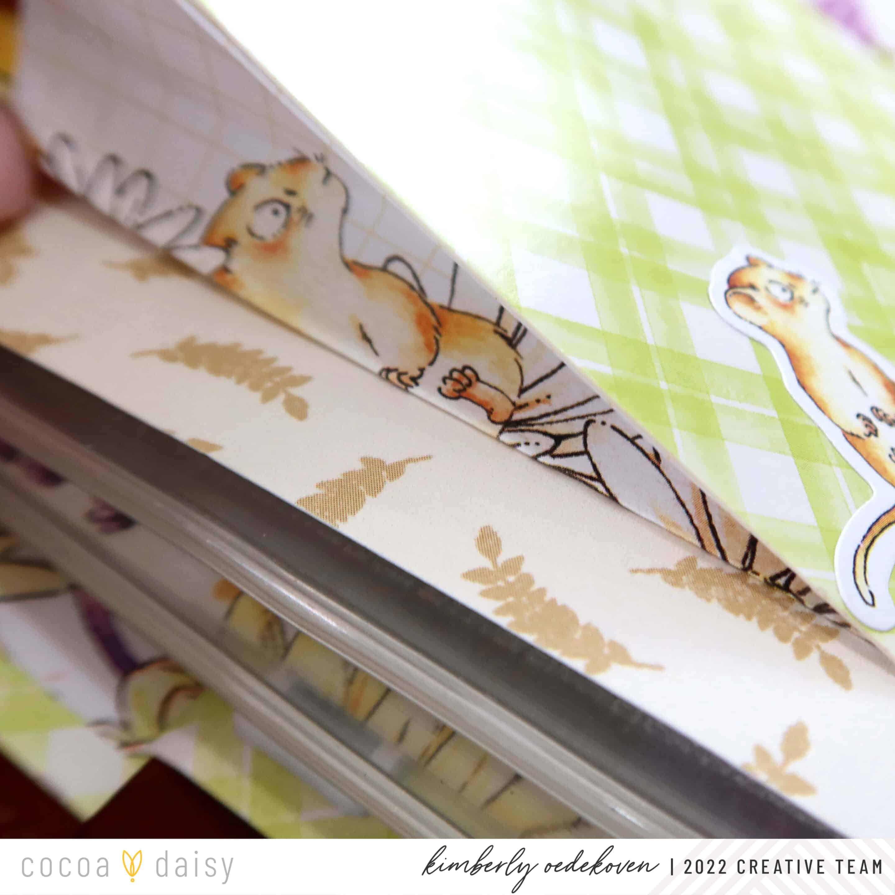 I took two sheets off the notepad and created 2 folded fans by folding back and forth, roughly ¼ inch in width. You can have as many folds as you’d like, but I found 3 to be just about right. Then I just attached it to the backside piece of kit packaging on both side edges. And yes, I got a little cheeky with it by having the squirrel peek out on either side because I did some “selective” folding:)