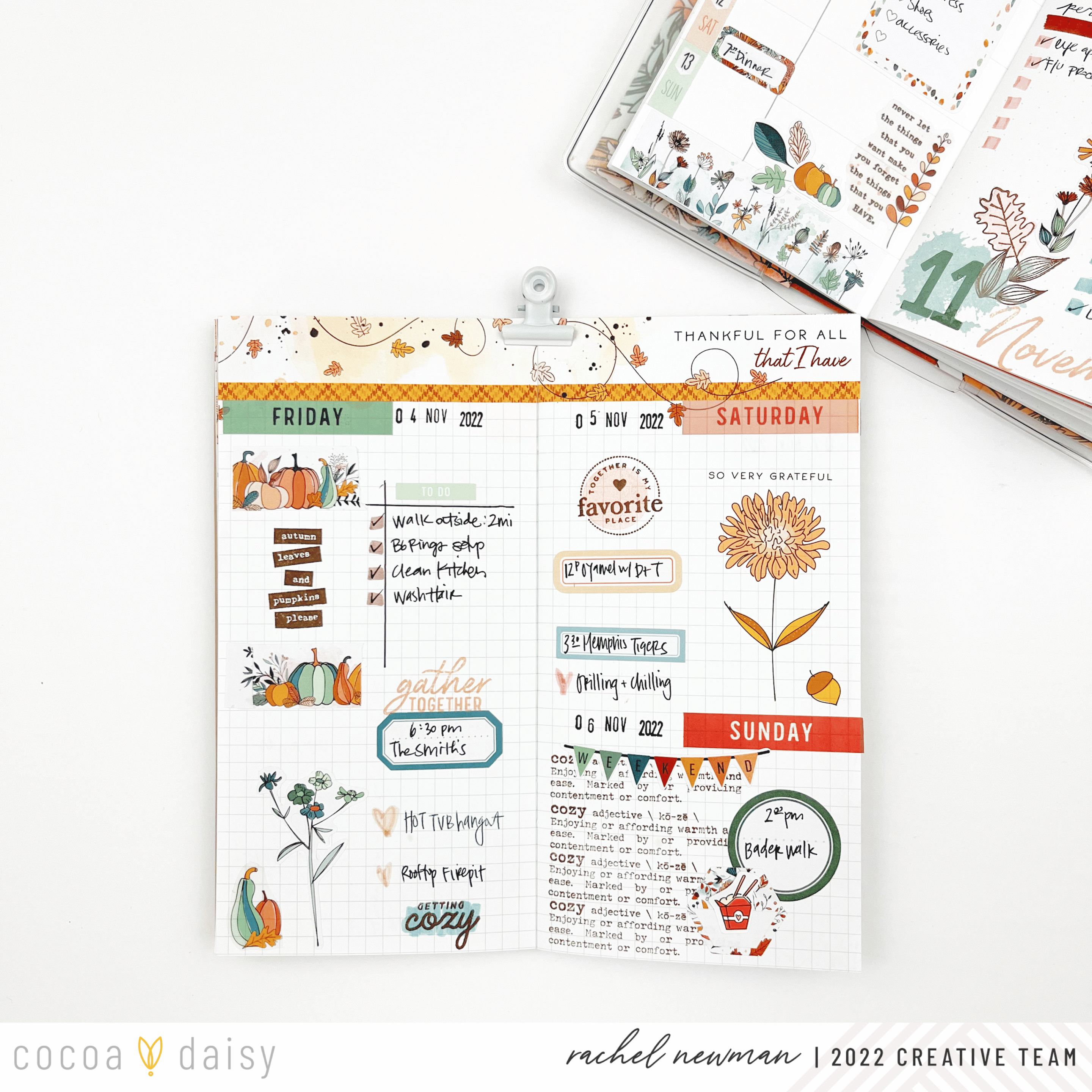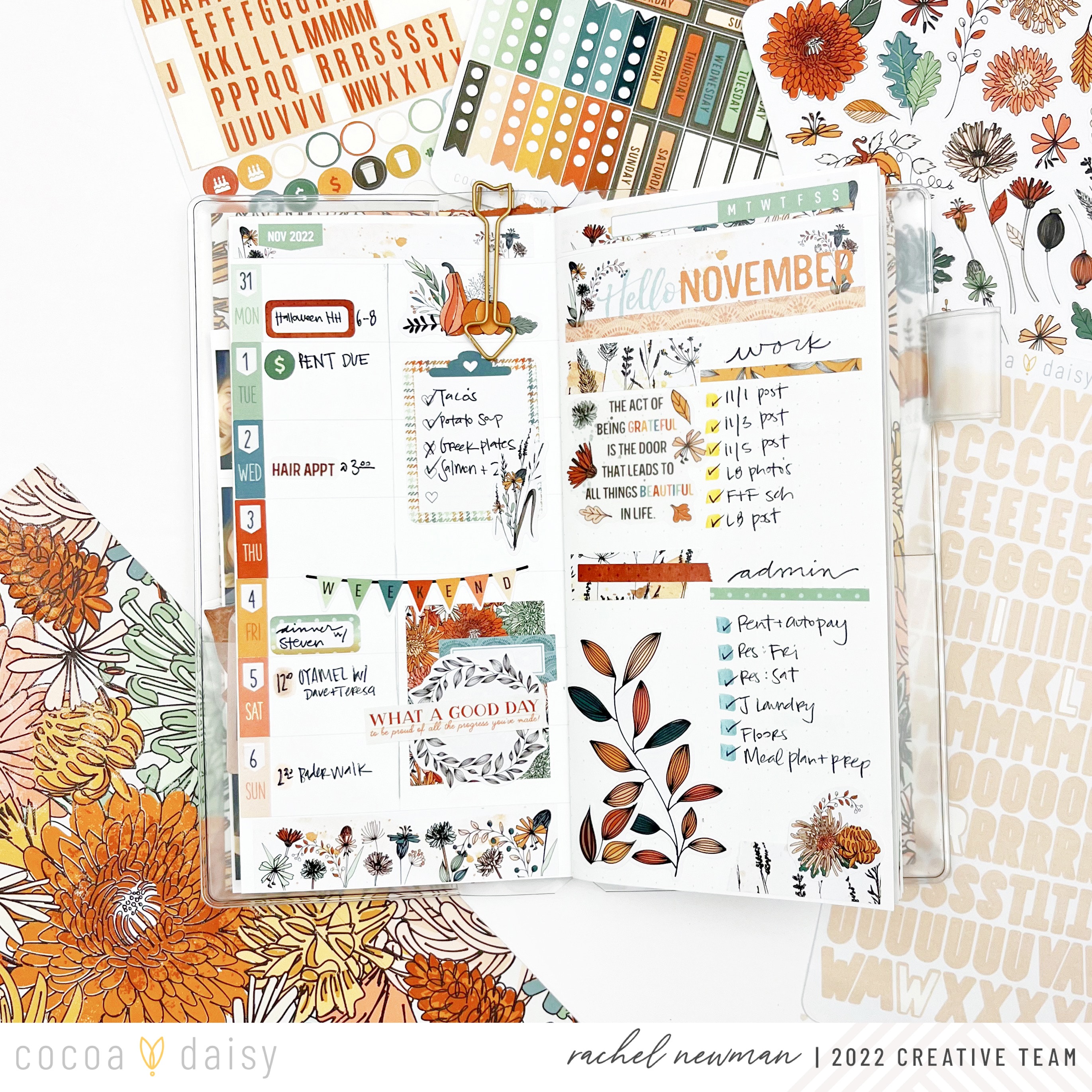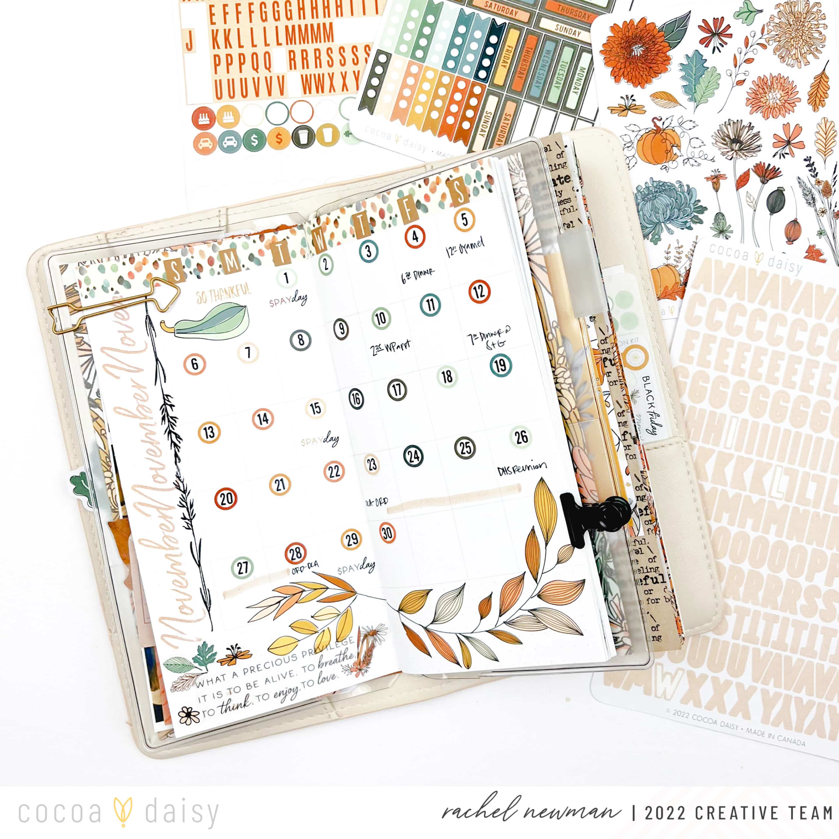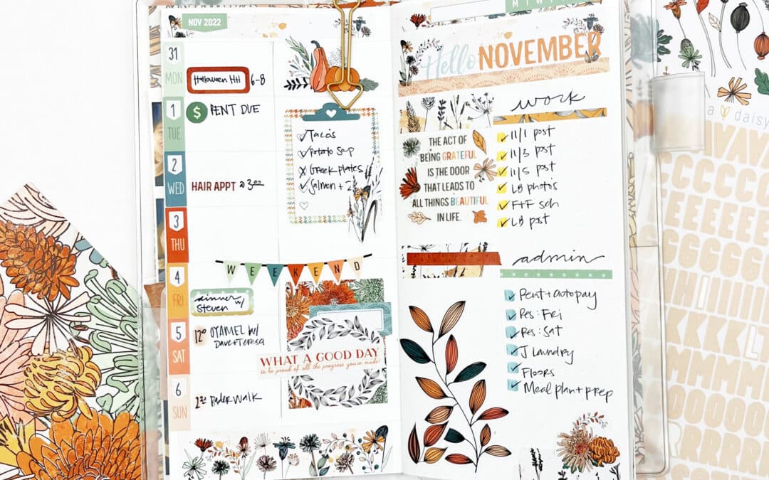 I set up my monthly spread with the help of my favorite date stickers from the Doodles & Dashes Kit II Planner Add-On Kit and alphas from the Doodles & Dashes II Memory Keeping Sticker Kit. I used the “November” stamp from the Doodles & Dashes II Traveler’s Notebook Memory Keeping Kit to repeat-stamp the month along the edge of the spread. To finish up, I decorated the bottom with rub-ons and stickers from the Doodles & Dashes II Daisy Weeks Sticker Kit, a must-have for planning in this size!