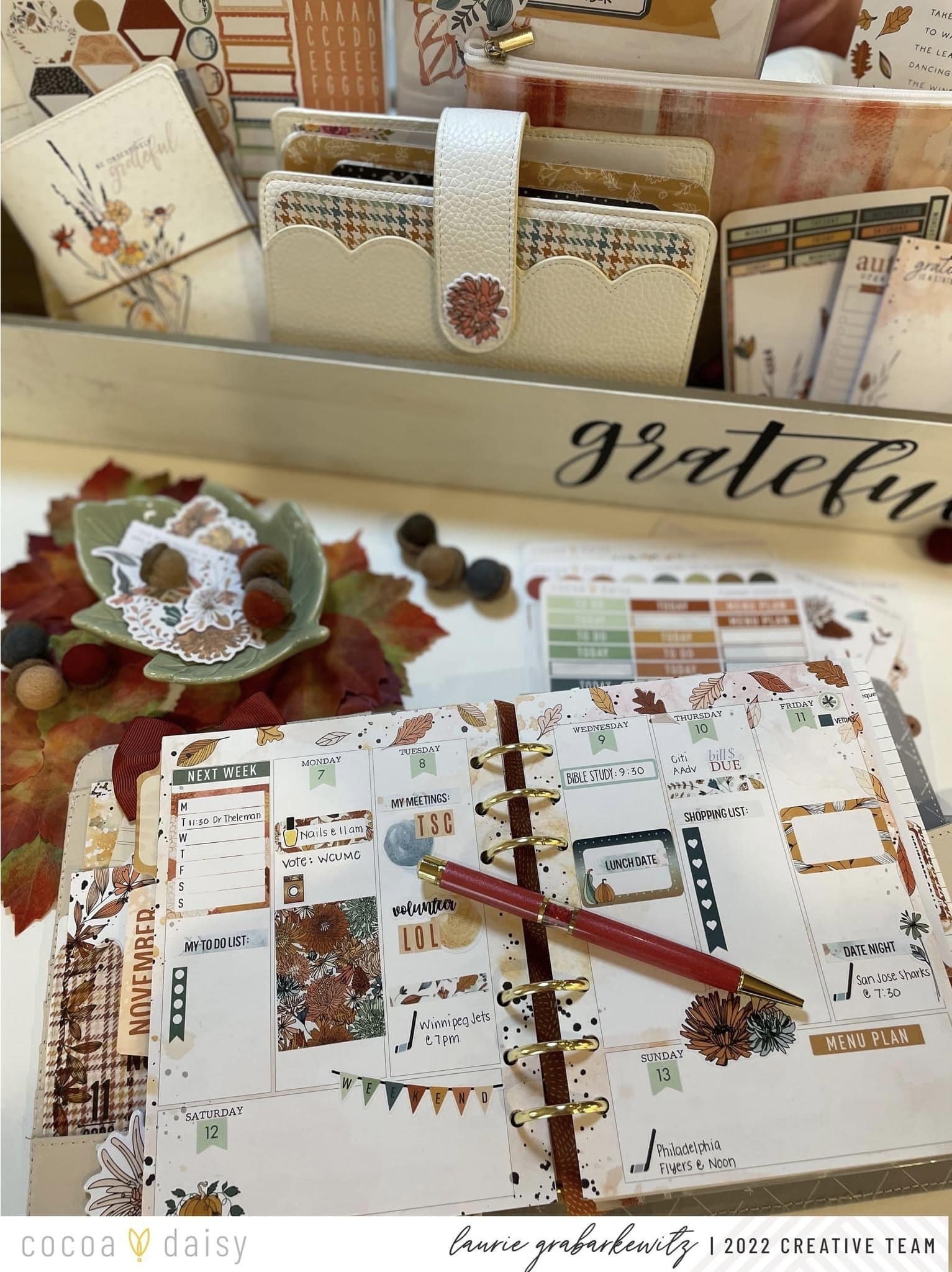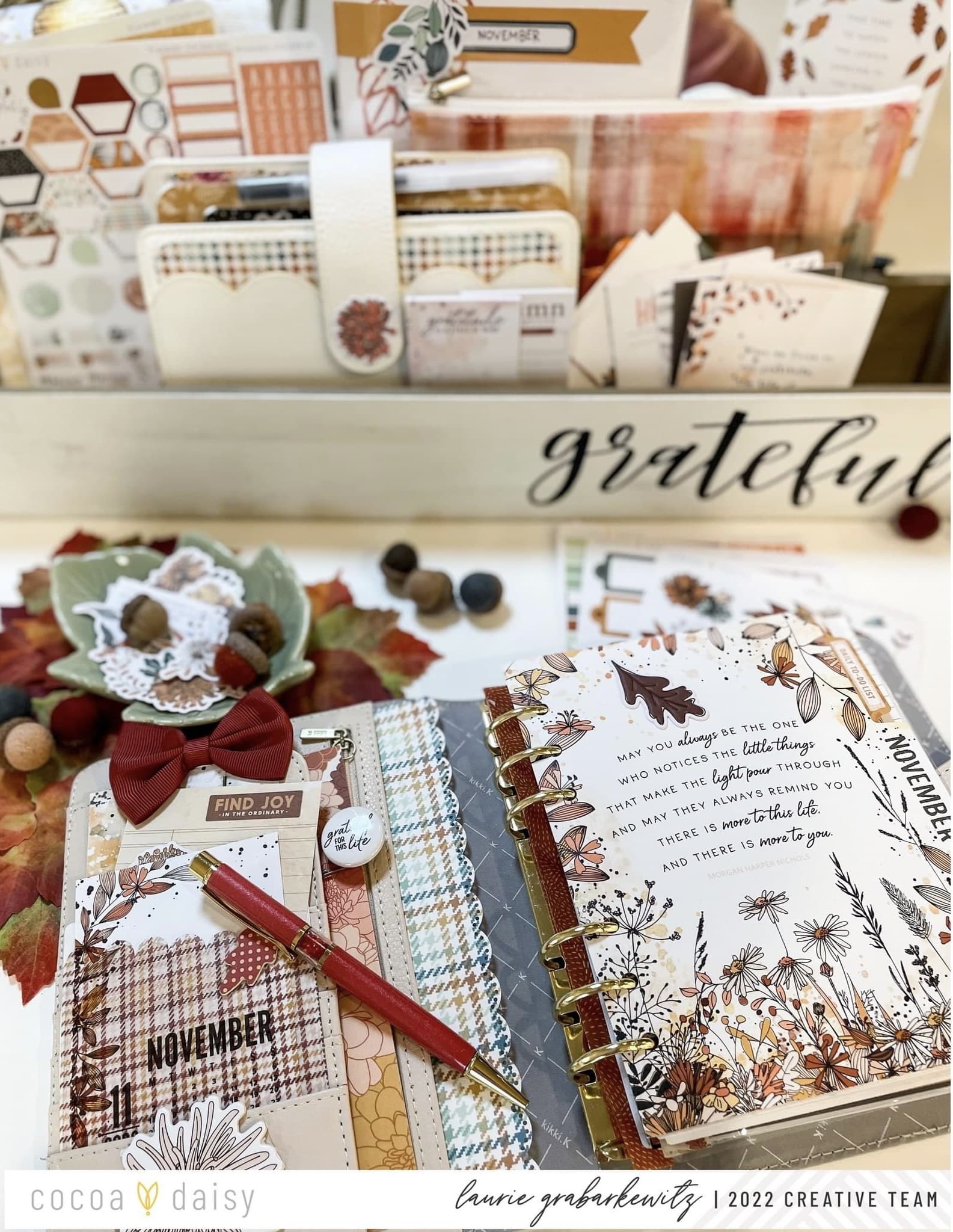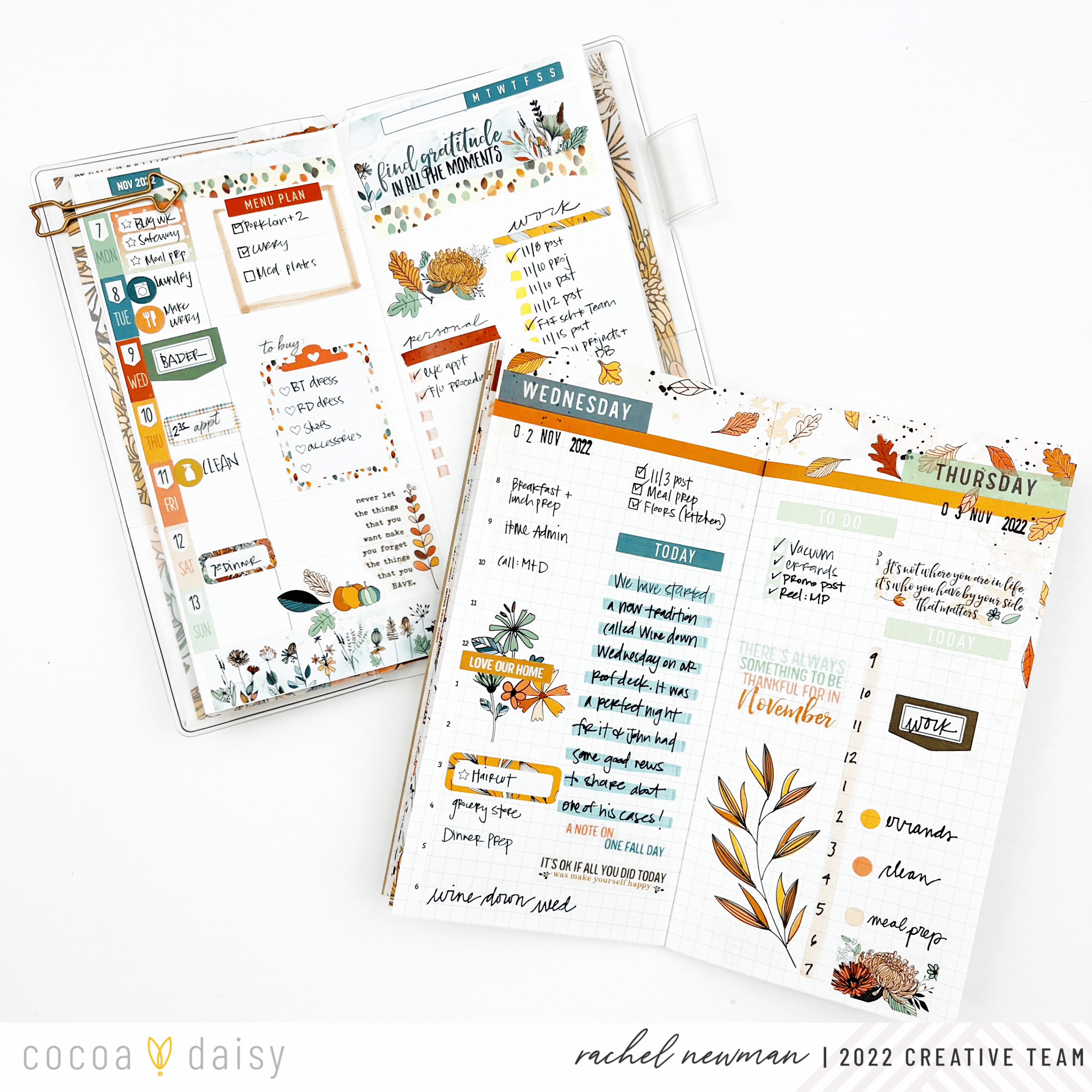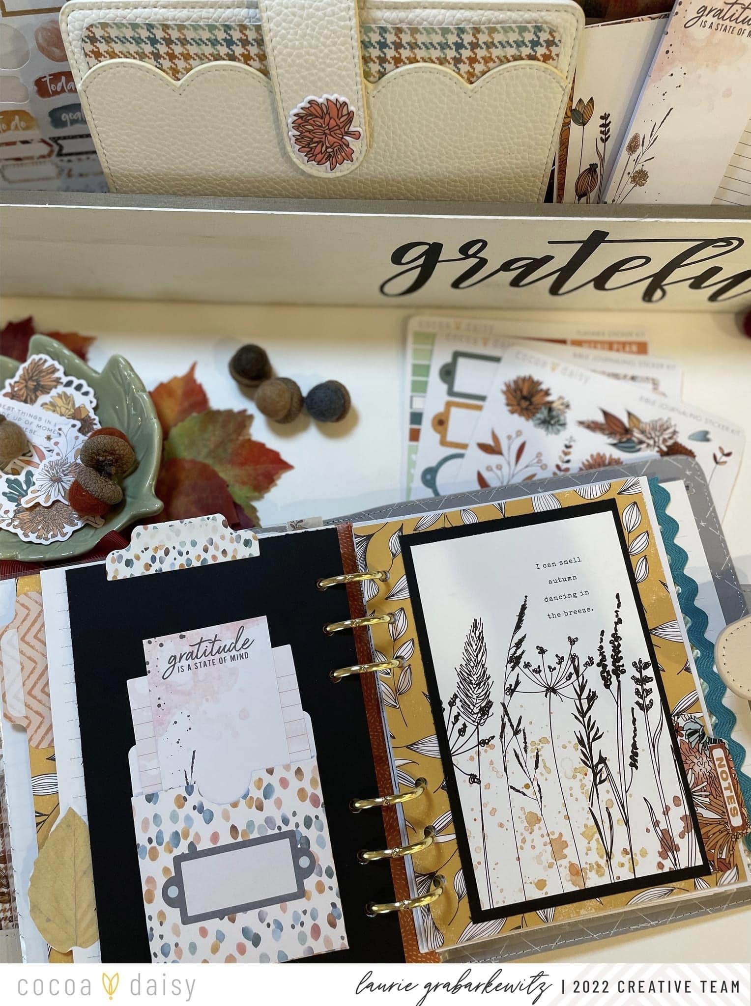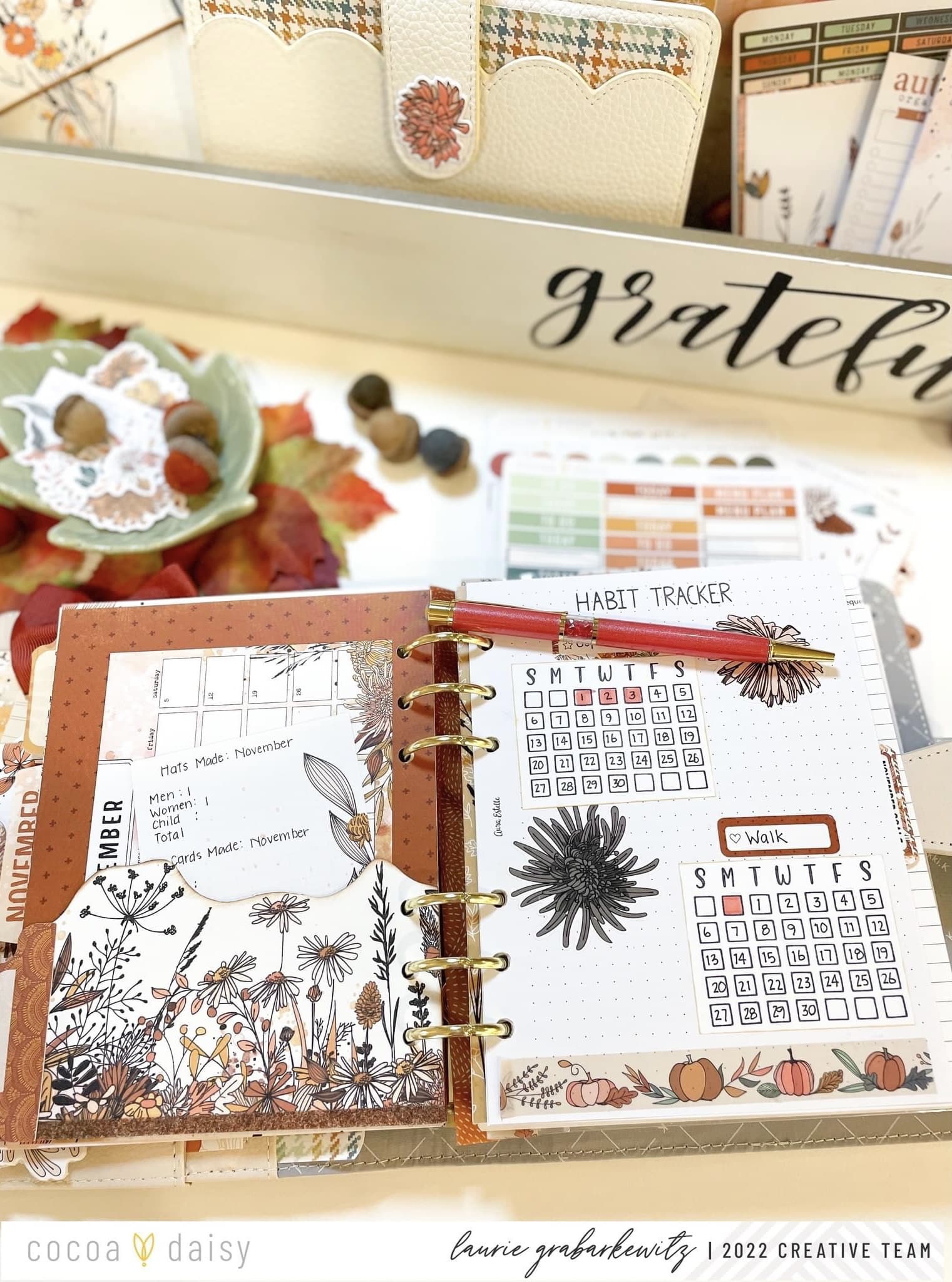 The Doodles & Dashes II Collection is so fun to play with. I really liked how it highlighted the concept of gratitude throughout the collection’s design. Did you notice how the colors and papers coordinate with the Autumn Thicket Collection and, of course, the previous Doodles and Dashes Collection? I chose my Kikki-K B6 rings planner to highlight all of the beautiful fall colors this month.