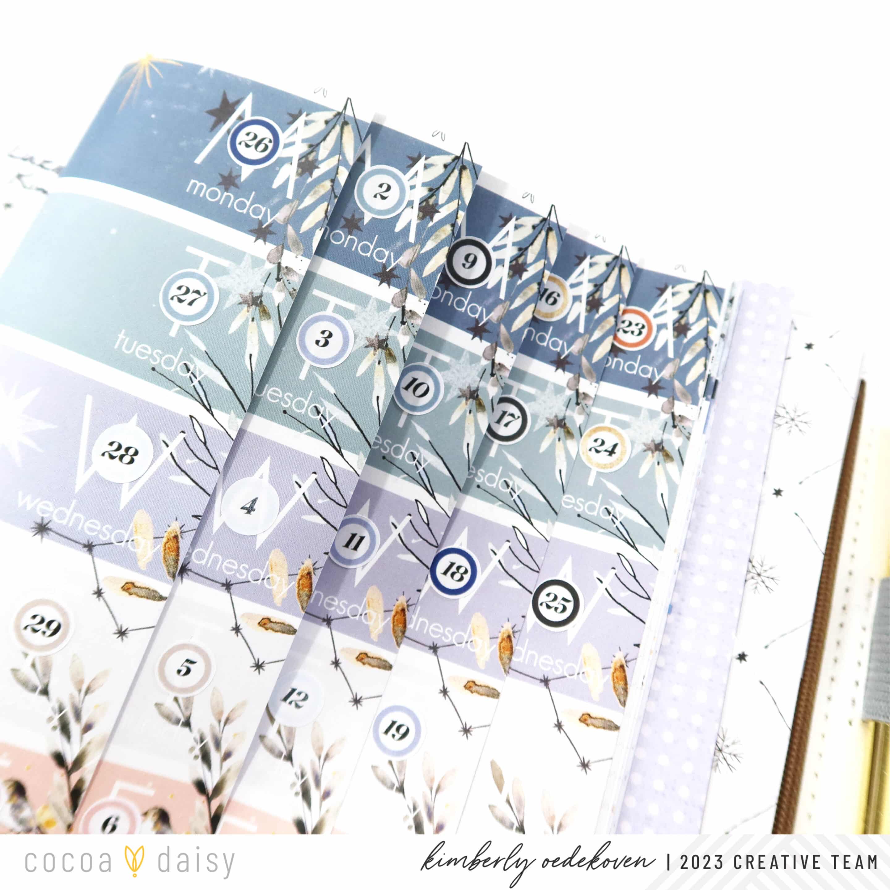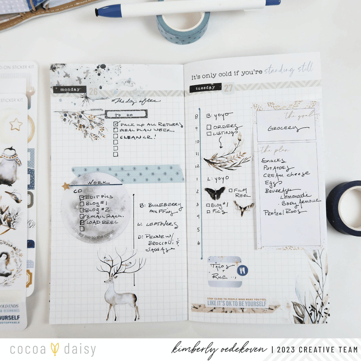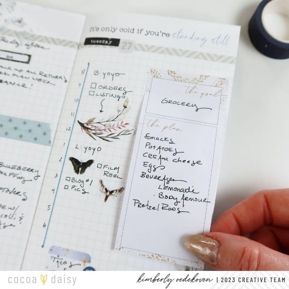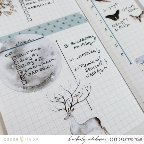 Some days (thankfully) there are no timed events to get to so I take those rare opportunities to get as much done as I can at home. I love the top portion to always be the priority task in a short list. Below the washi tape from the Nordic Skies Classified Planner Kit, I have the moon sticky note from the same kit which houses my Cocoa Daisy tasks. I add a touch of depth with such little work!
