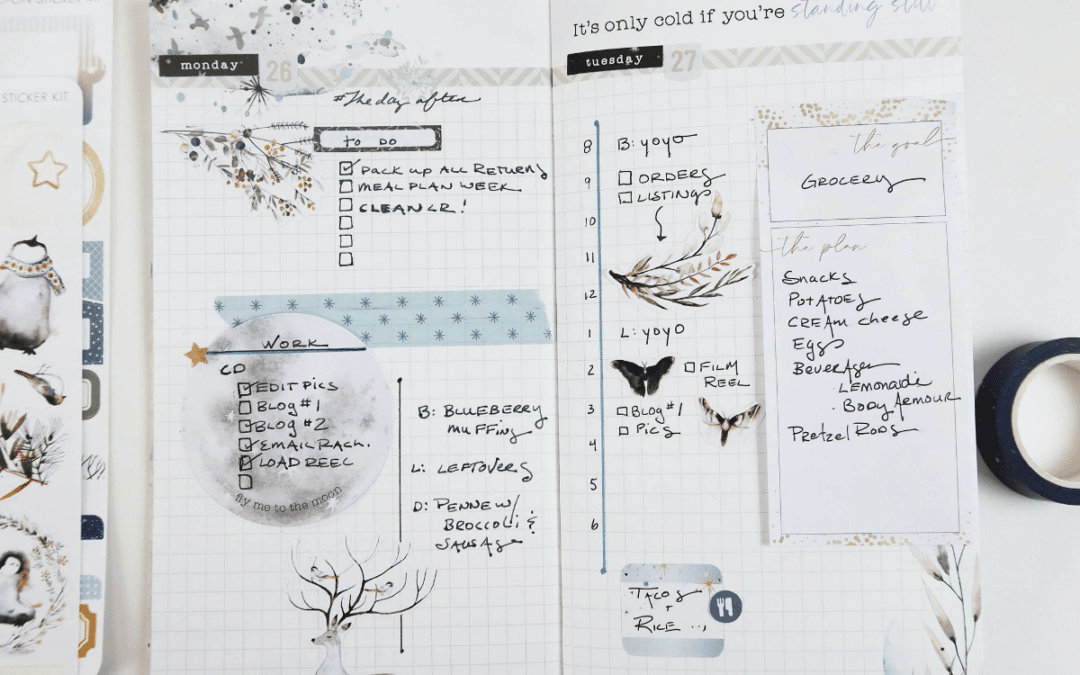 On the next day, while I still did not have any timed events, I thought I would create a time-blocking map to help make sure my day ran smoothly. I used stickers from the Nordic Skies Planner Add-On Kitto fill in the time spaces and place-specific tasks to be done during that period. And hello sticky note again! This time it houses my grocery list to give to my husband and can easily be removed for his hasty departure.
