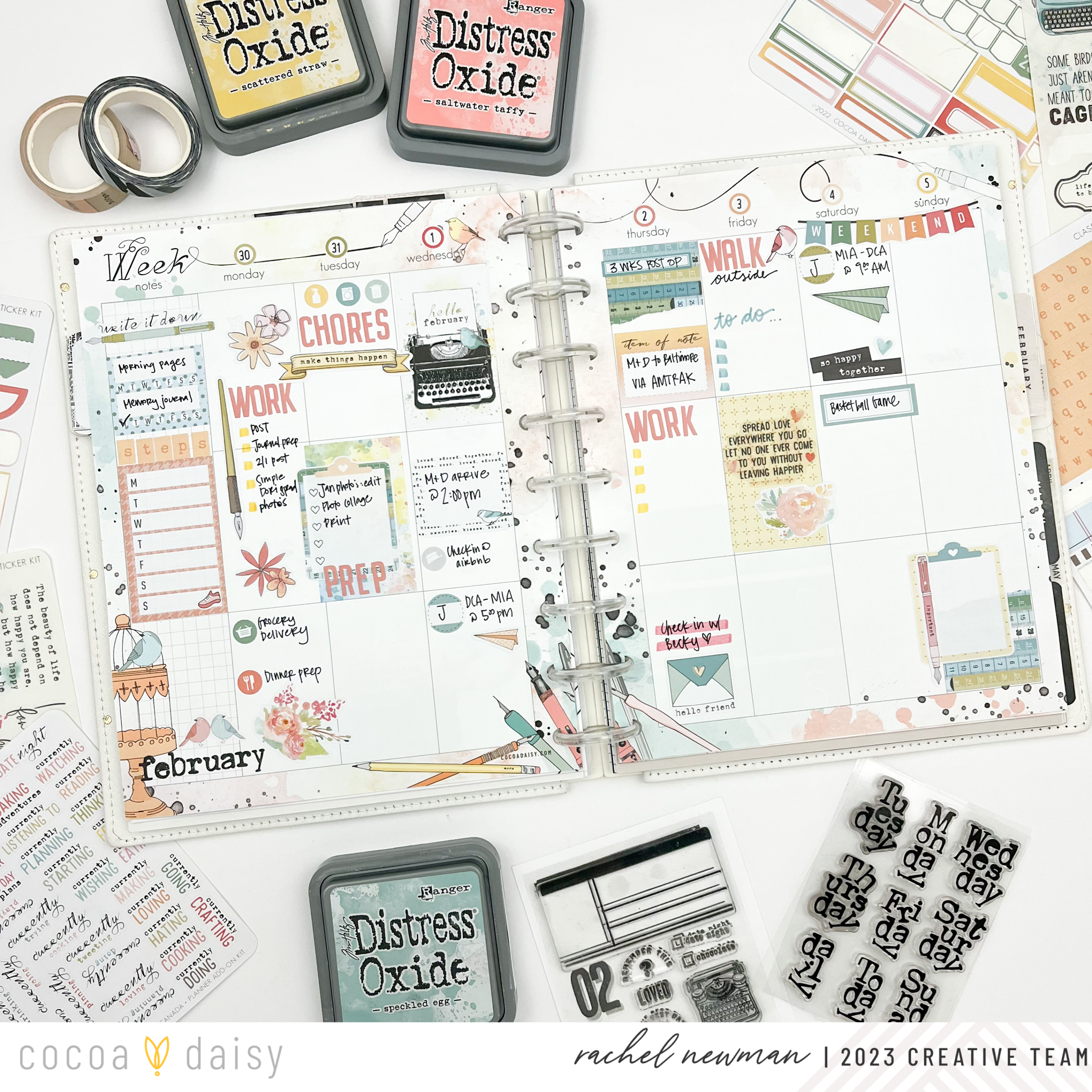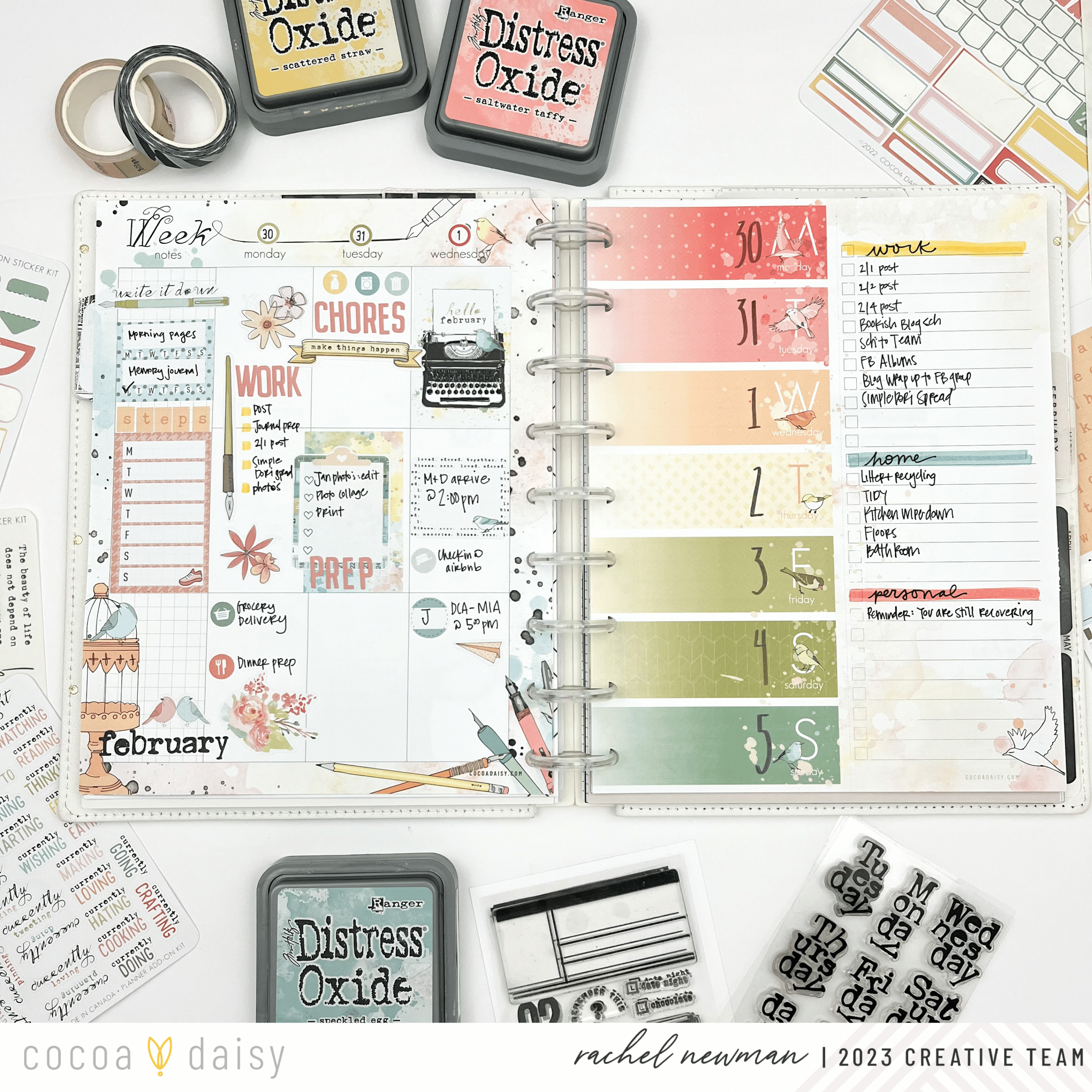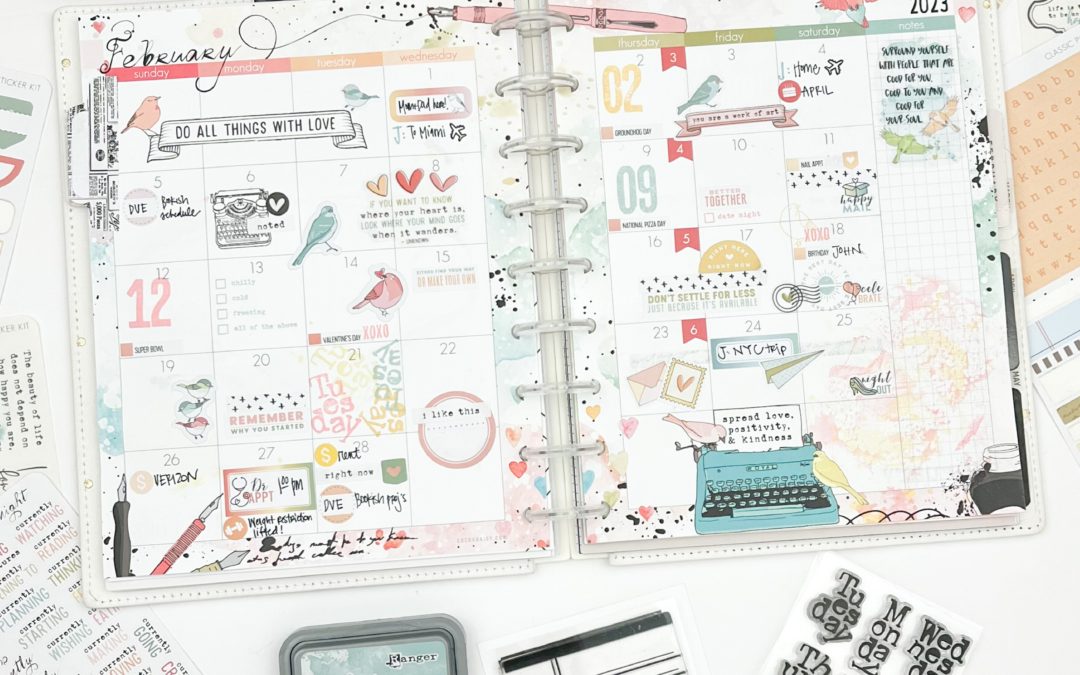 I could not WAIT for February and the chance to dive into the Paperie Collection. The colors, illustrations, patterns, embellishments, and stamps give me all the “heart eyes”! I especially love the Paperie Vertical Classic Inserts that come with a main divider/dashboard that is a standalone page. This allows me to create a monthly section for my tasks and notes that I refer to when planning my weeks. And I love having a space to decorate the back of my month of two pages (shown here on the right side). The watercolor design inspired me to do a little ink “smooshing”. This technique involves grabbing a piece of plastic packaging, stamp inks, and a little bit of water. I ink up the packaging, spritz a little water, fold the packaging to move the ink around, turn it over and “smoosh” it onto the paper.