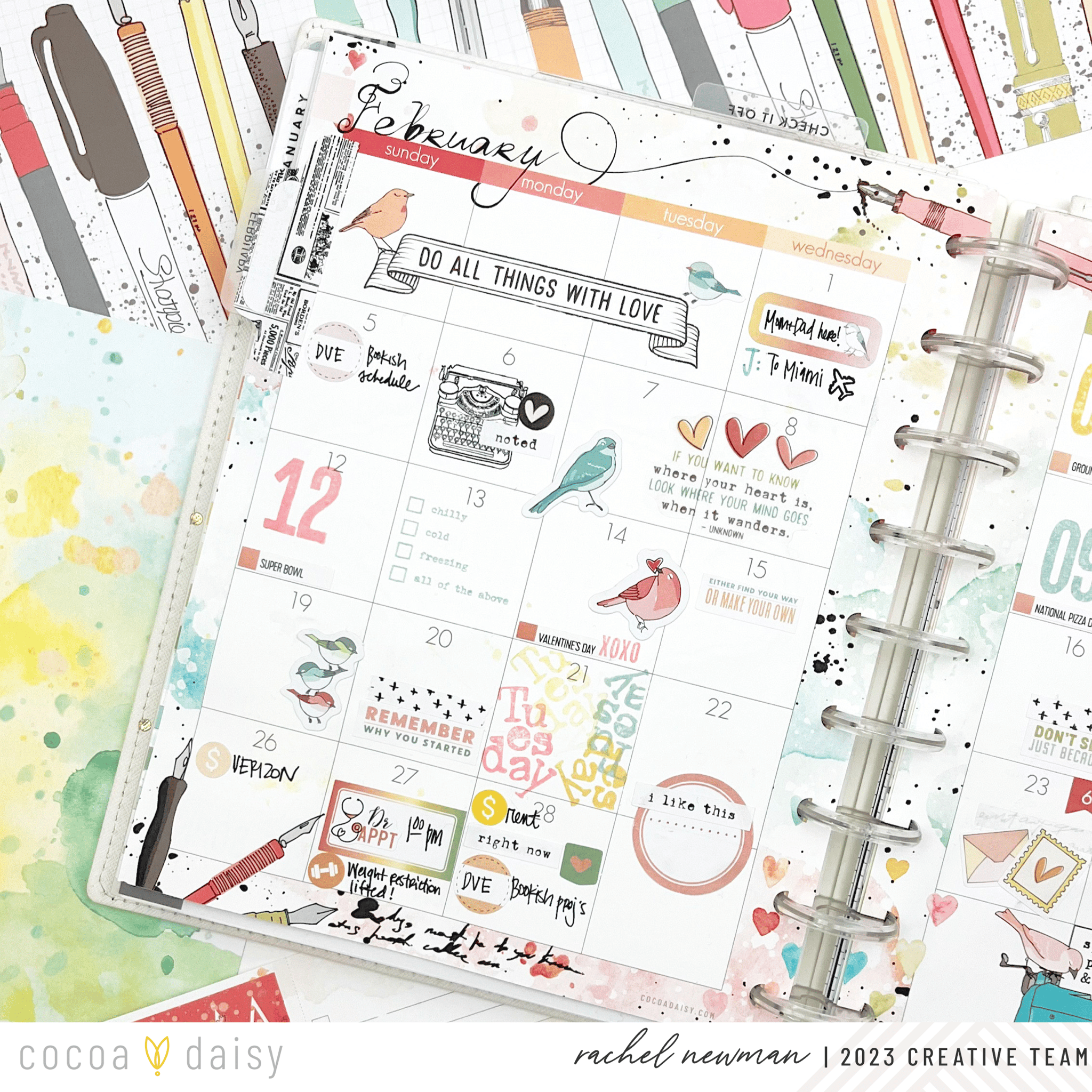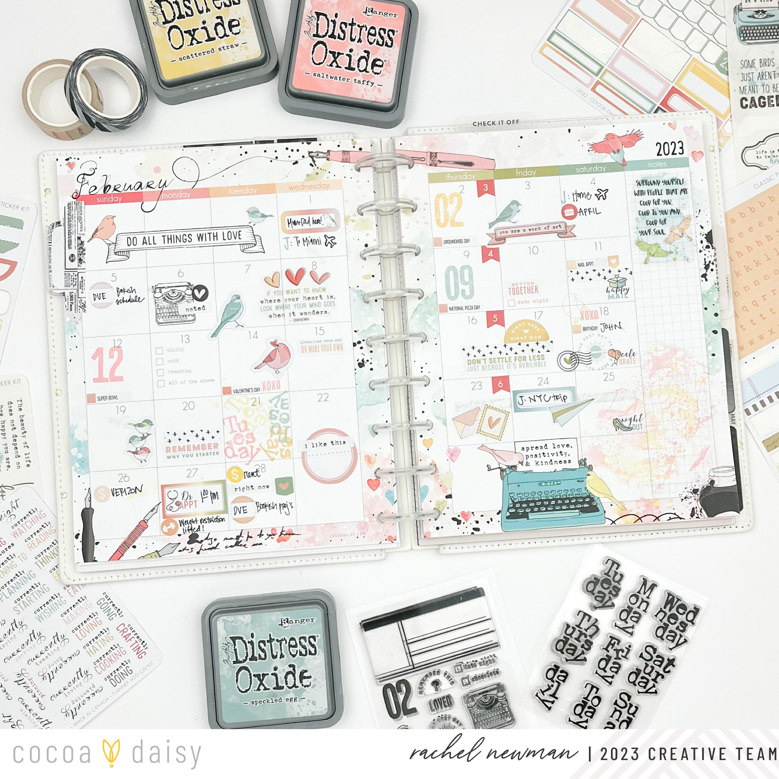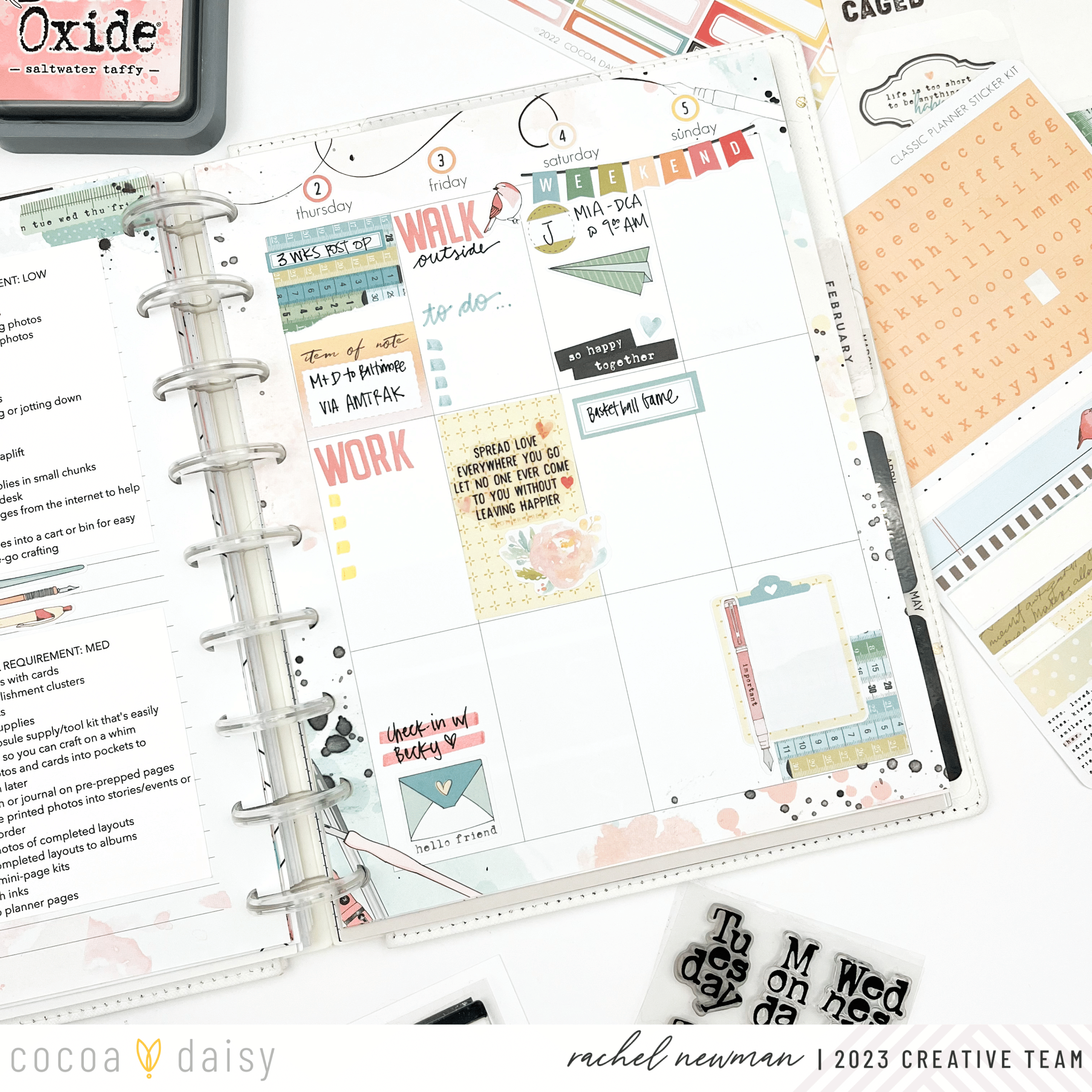 I could not WAIT for February and the chance to dive into the Paperie Collection. The colors, illustrations, patterns, embellishments, and stamps give me all the “heart eyes”! I especially love the Paperie Vertical Classic Inserts that come with a main divider/dashboard that is a standalone page. This allows me to create a monthly section for my tasks and notes that I refer to when planning my weeks. And I love having a space to decorate the back of my month of two pages (shown here on the right side). The watercolor design inspired me to do a little ink “smooshing”. This technique involves grabbing a piece of plastic packaging, stamp inks, and a little bit of water. I ink up the packaging, spritz a little water, fold the packaging to move the ink around, turn it over and “smoosh” it onto the paper.