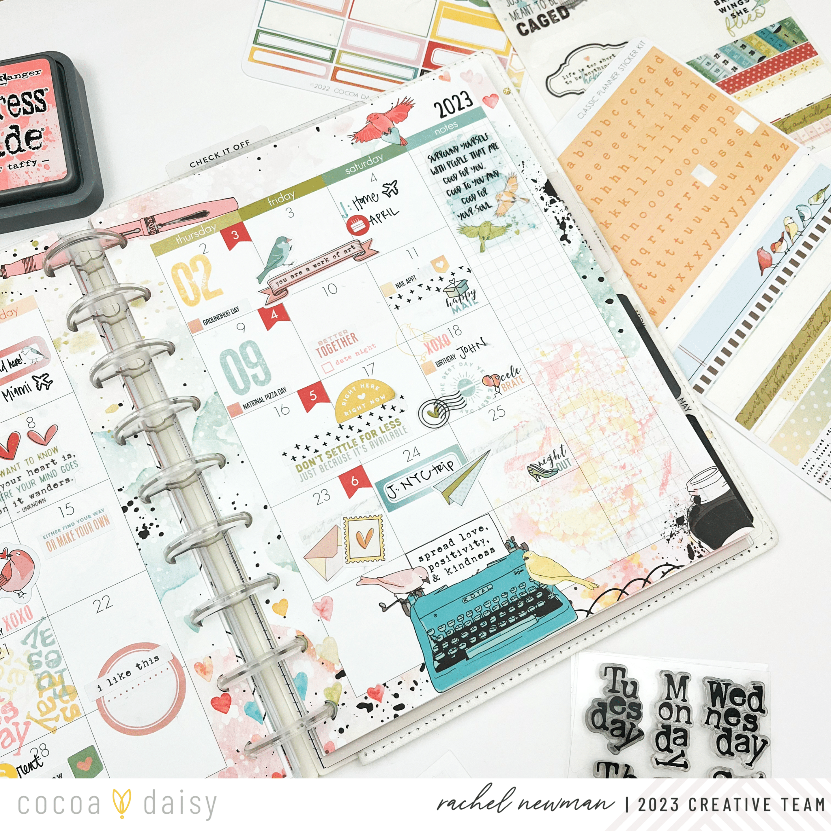 The monthly spread is great for jotting down events, deadlines, bills, and holidays. It is also a great place to play with stamps, rub-ons, and embellishments from the collection.
