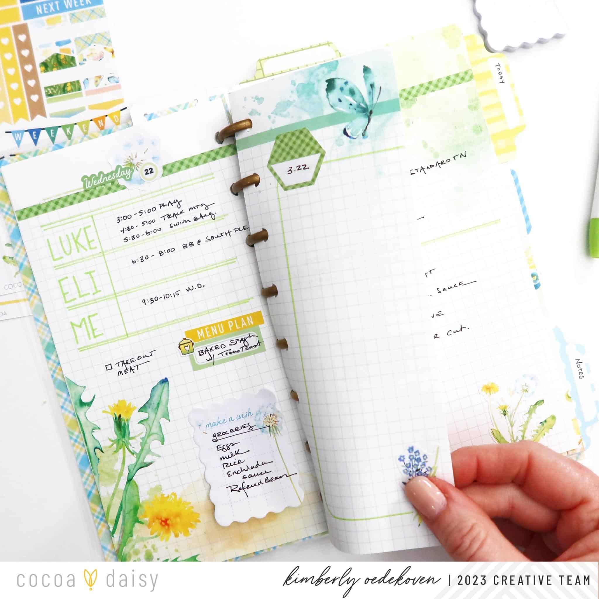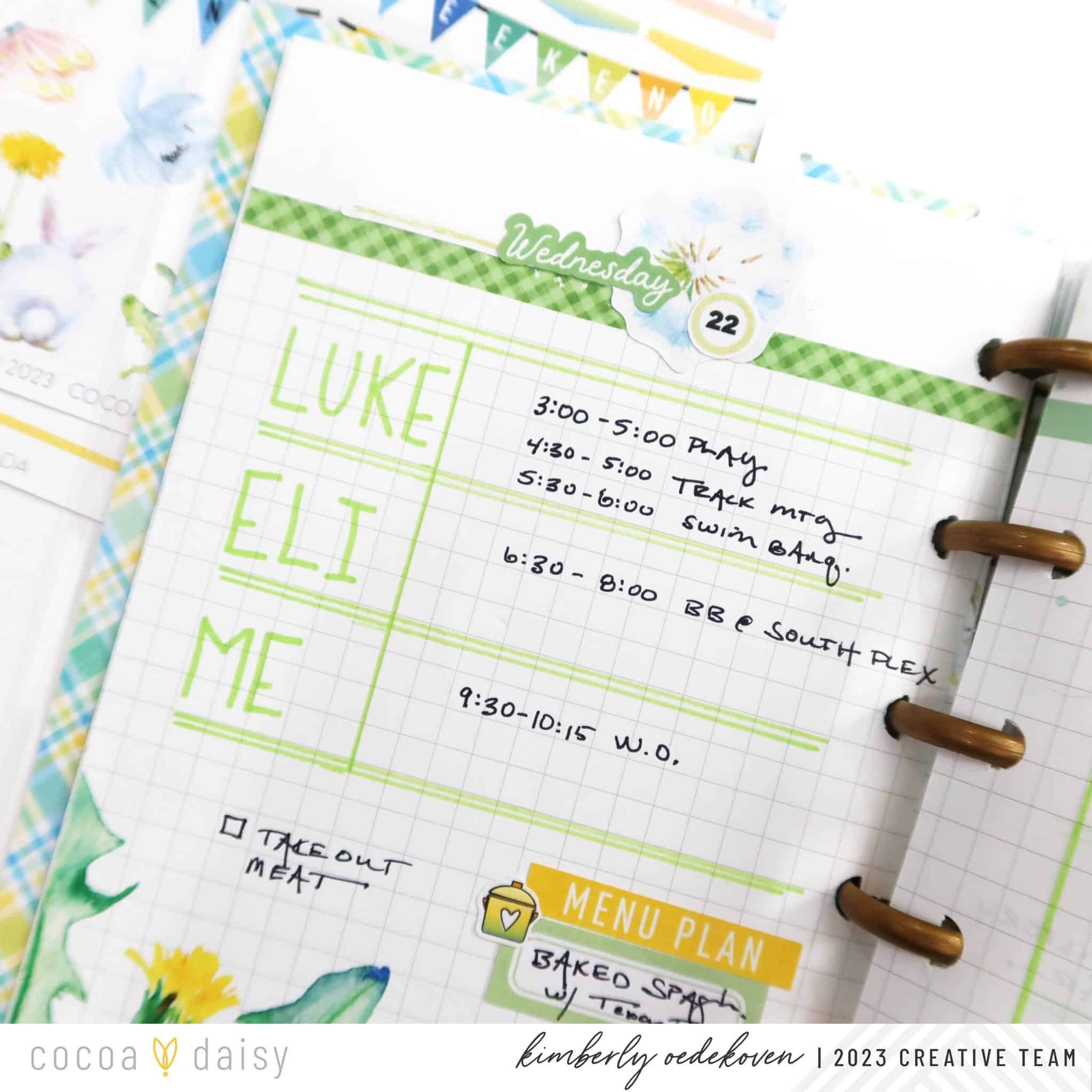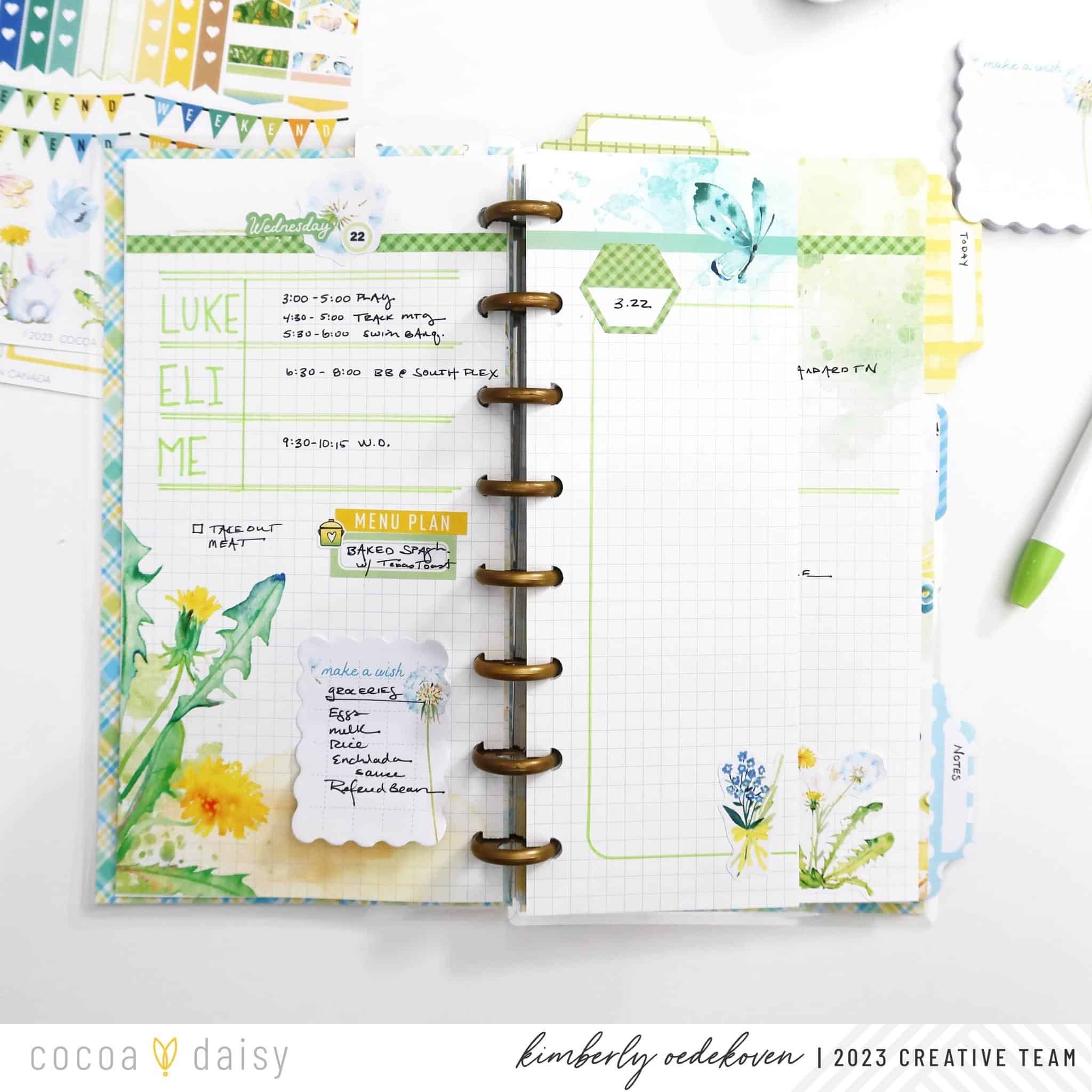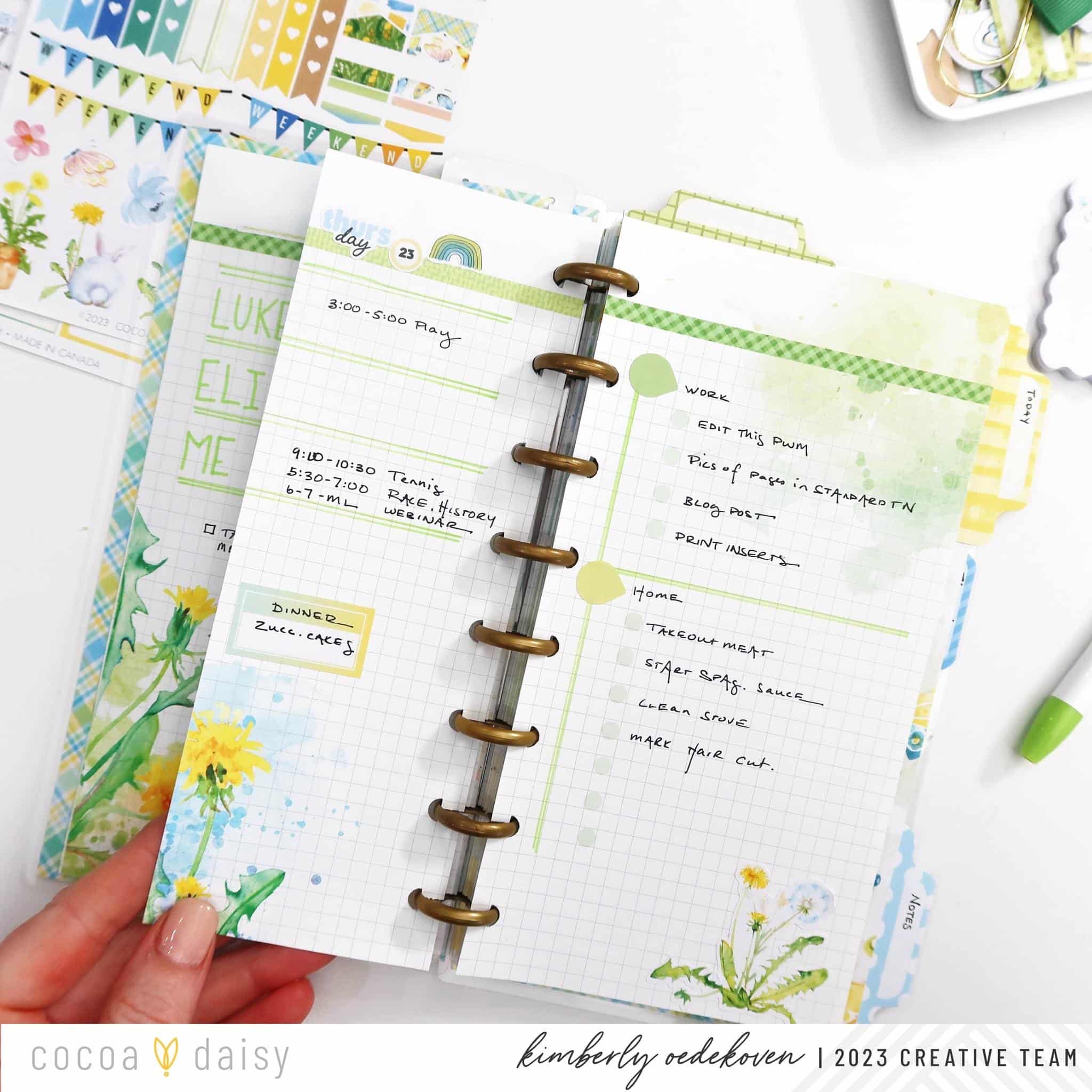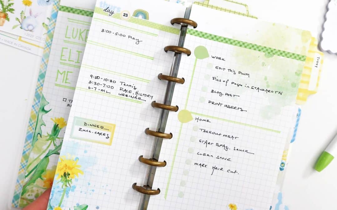 If you’re like me, sometimes I hate rewriting what I already put down. The way I constructed this week’s schedule in my Dandelion Wishes Standard Daisy Dori minimized rewriting information. Yes, I did punch it for rings but you can do this with any size bound or unbound insert.