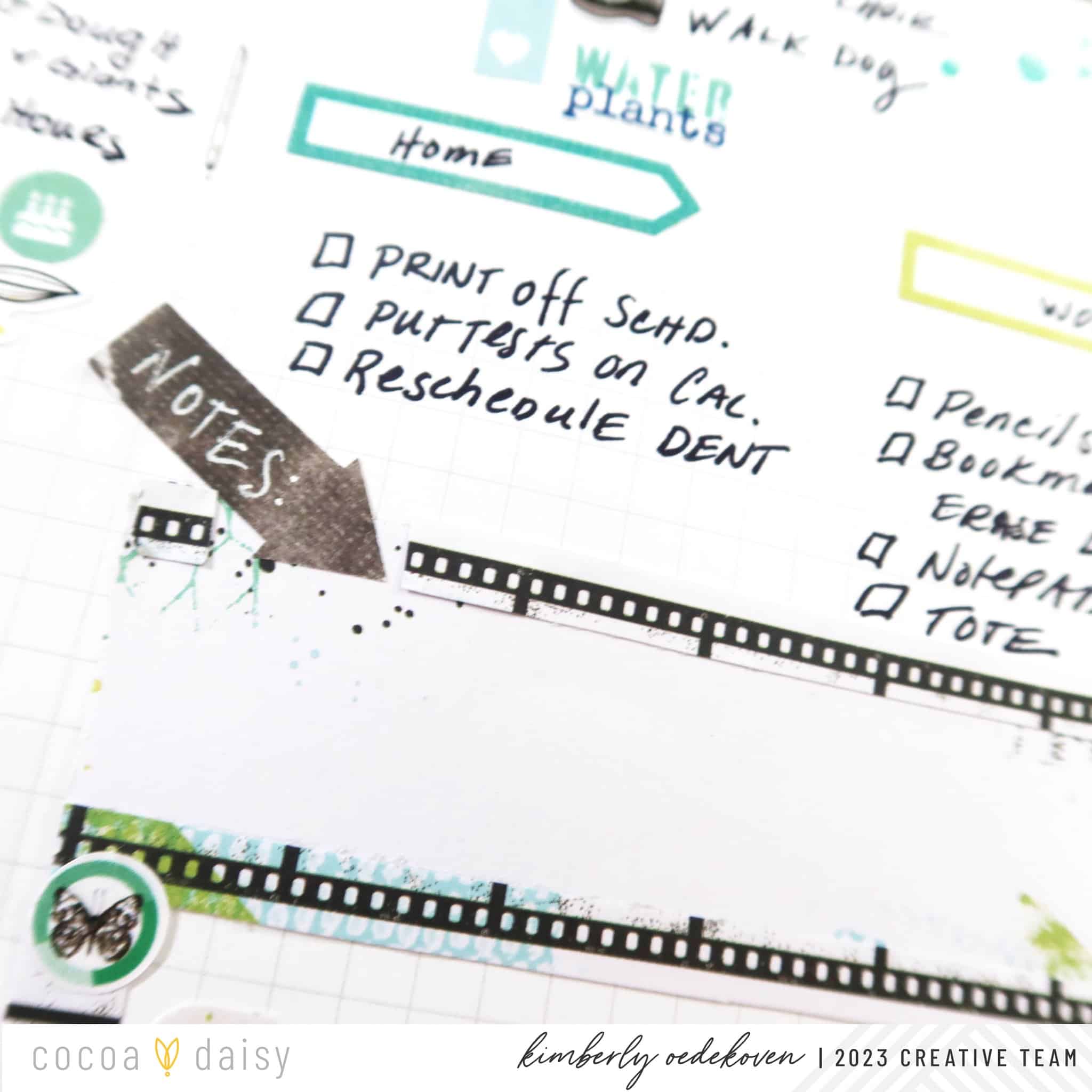 Just above that, I had some space to write some notes. Instead of just making a section with washi, I used the sticky notes from the Daily Journal Planner Kit to add a little background flair. I wouldn’t fit as is, so I cut the film strip off, trimmed the edges off, and added it to the top and bottom outline of the section.