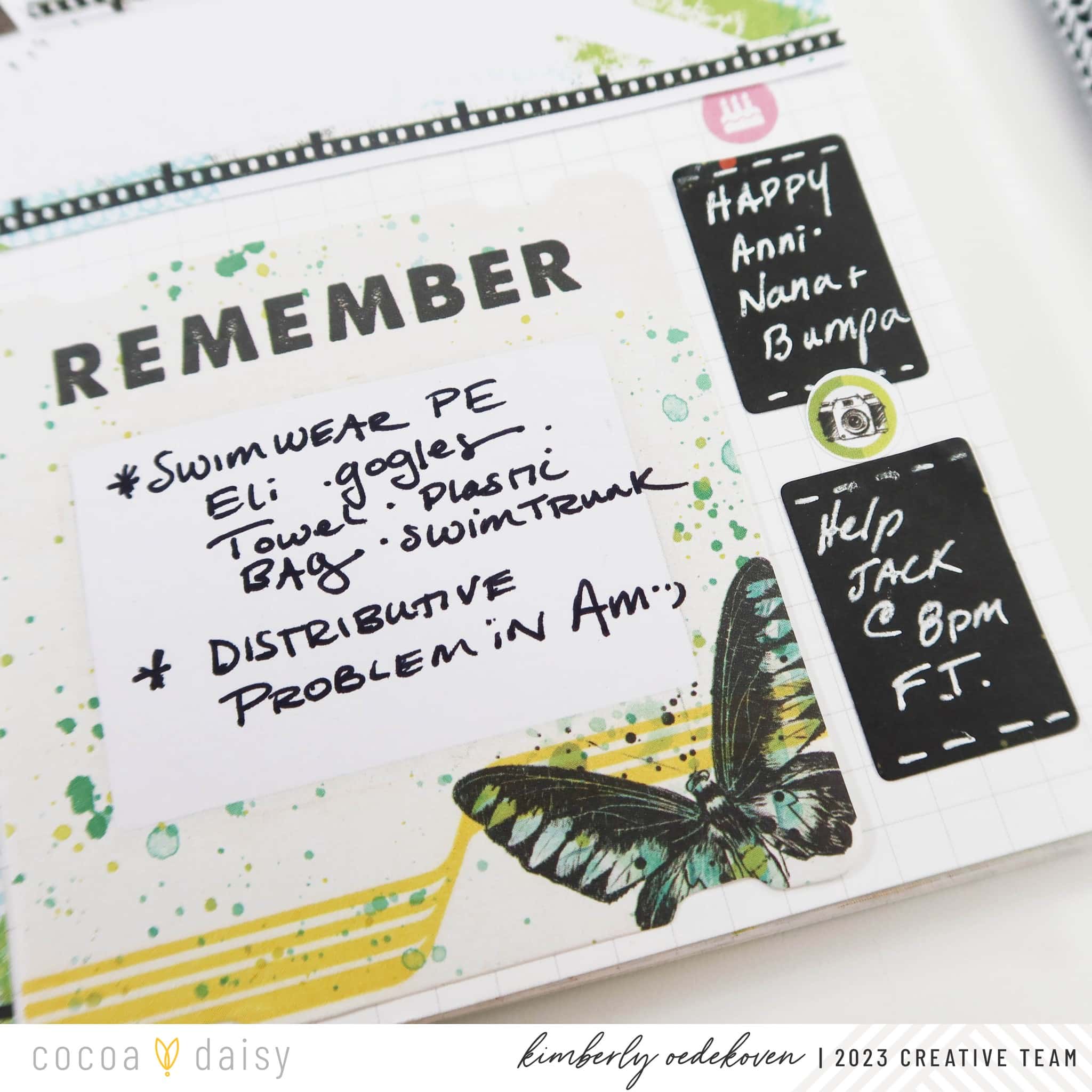 I love using the kit sticky notes from the Daily Journal Classified: Planner Kit adhered down on my planner page. It doesn’t add much bulk but it also gives me a place to write or remember things that may not be a timed important event, noticeable. The black rectangles on the right were the negative space of the film die from the Daily Journal Planner Add-On Kit. Easy to write on with a white pen and enjoy the contrast.