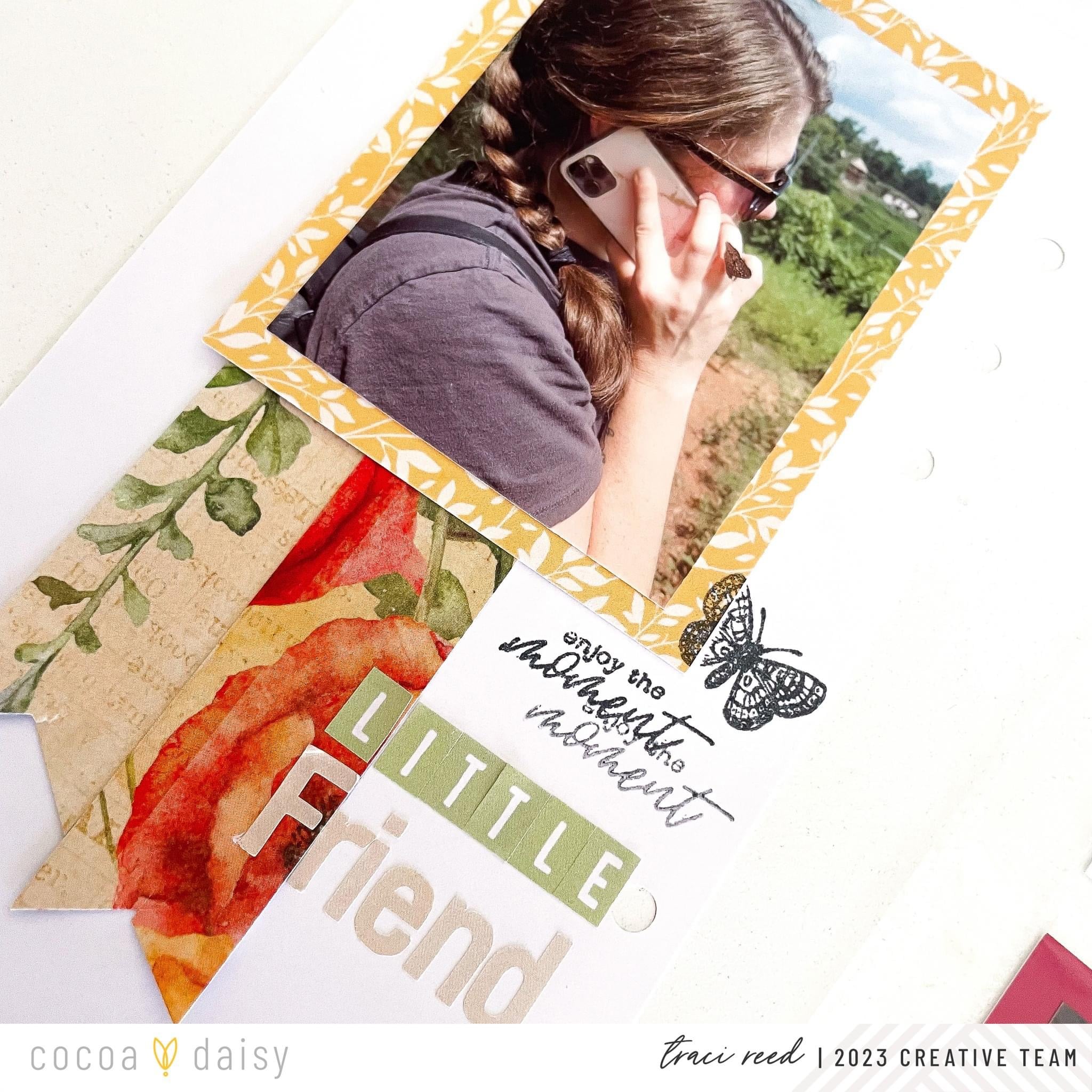 One of my favorite things to do on these little collages is to frame in both sides of the picture with a sticker or die cut to really focus the viewer’s eye where I want it to be – in this case on the butterfly! I used one floral die-cut on both sides of the card so I didn’t waste anything and then topped it with a few more die cuts and stickers to complete the collage.
