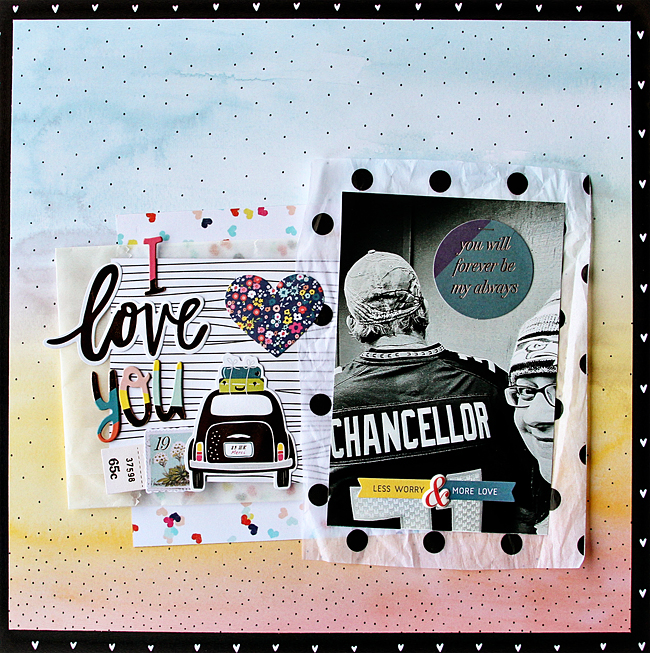 I’m here to say, use the stuff you love, even if you don’t think it works. I love how these rose gold items helped to add softness to my black & white photo of my hubby and myself in our Seahawks gear. The rose gold added that “pink” element I needed for the “love” theme of this page. And that cute foiled car, I imagine us going on road trips all the time. I just wish we had more time in the days so we could that happen more often. Some day…