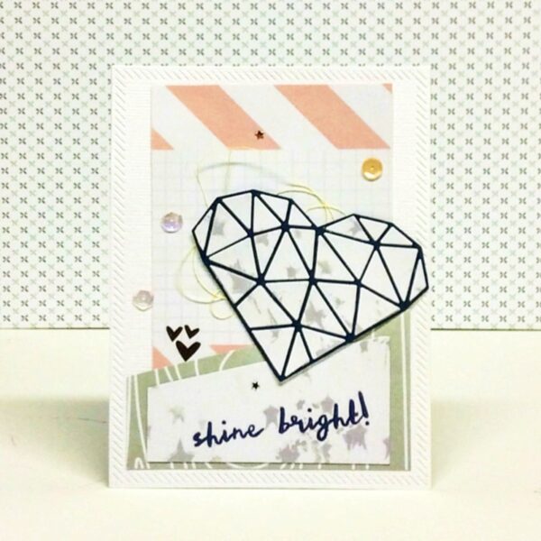 I chose to spotlight on the journaling cards in the DITL kits. I love to use them not only for pocket pages, but because they can easily be used as pattern paper and sentiments on cards. I used two journaling cards in this card. Cutting the Shine Bright 3×4 card in two. One half for the sentiment the other half in my die cut heart. Another journaling card was used as a background behind the focal point.