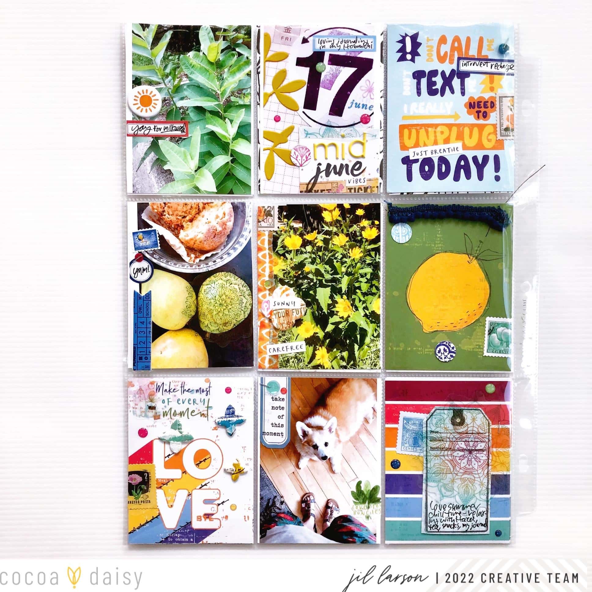My theme for this mid-June page was unplugging and allowing myself relaxing introvert time in the summer. I built my “Mid-June vibes” message on top of a photo of my journal from June 17 to emphasize how much I’ve been enjoying journaling. I embellished the photo by stamping “June” and using alpha stickers and labels from the Spice Market Collection on a cut-up card. The labels with bits of handwriting occur throughout the spread to unify through this embellishment choice. I varied the labels a bit. Three are from the Spice Market Memory Keeping Sticker Kit. One is a die-cut label with stamping “take note of this moment” and vertical orientation.