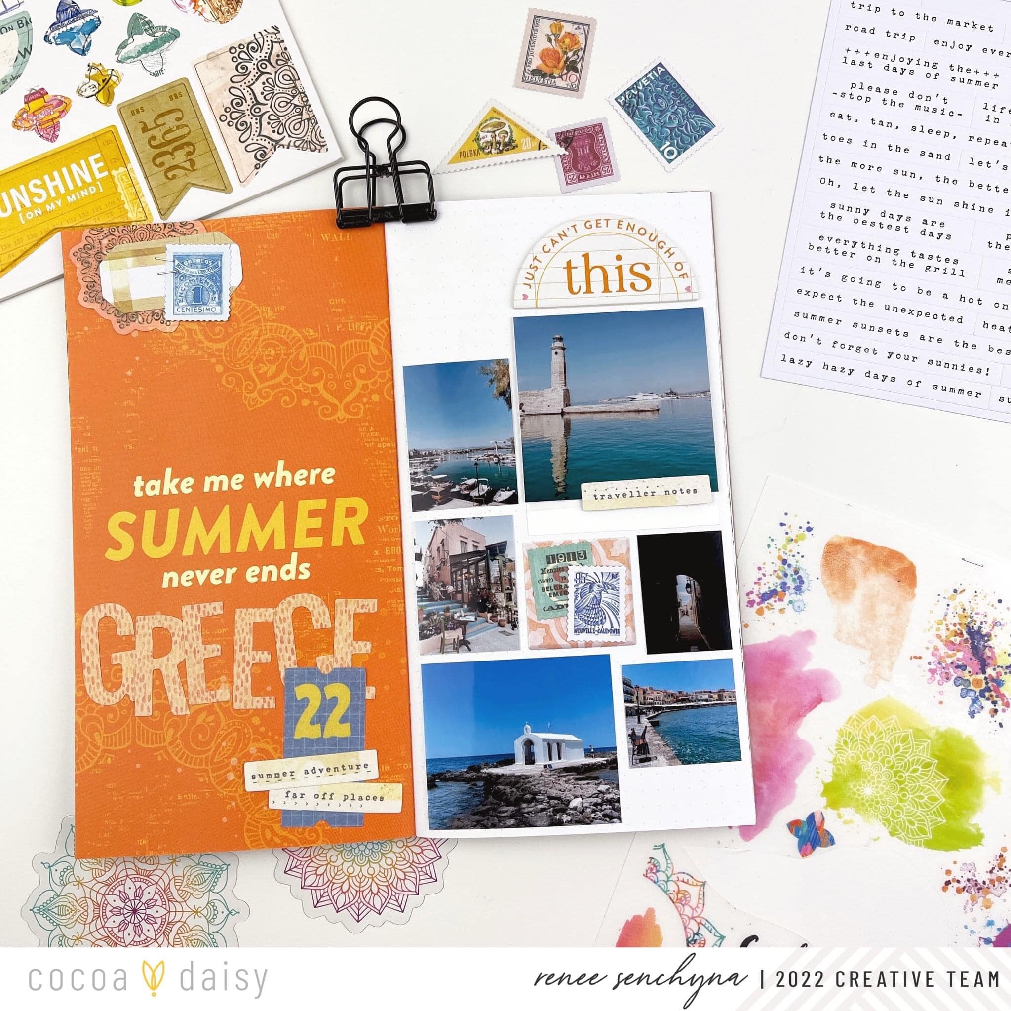 On the left side of the page I started by adding the word Greece underneath the quote using the sticky cardstock letter stickers from the Spice Market Classified: Memory Keeping Kit, I added a cardstock sticker from the same kit, then added 2 of the word phrase cardstock stickers from the Spice Market Traveler’s Notebook Memory Keeping Kit on top. Whenever possible I like to add my embellishments in groups of three.