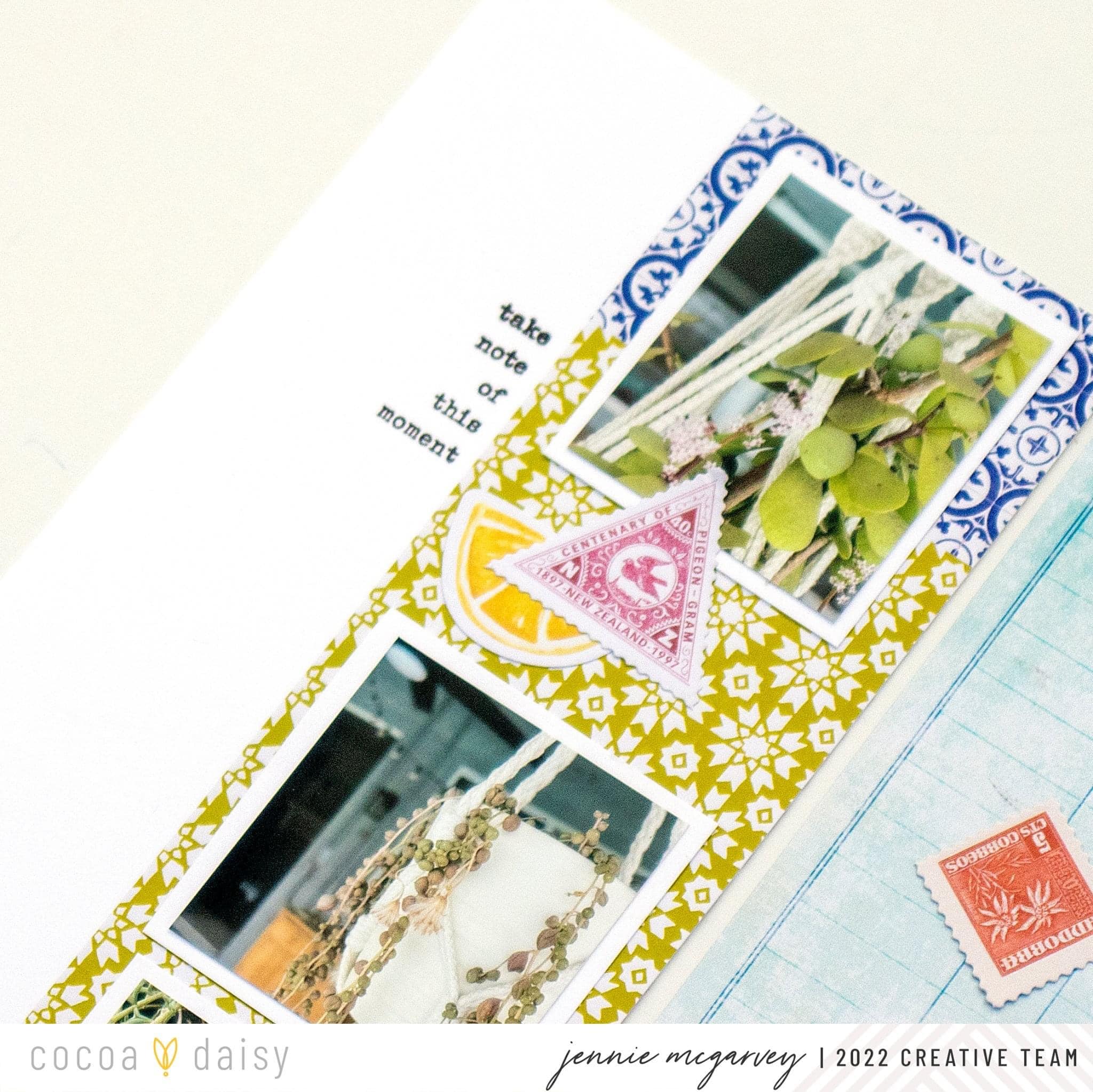To start, I selected two patterned papers, both the ledger and the green + deep blue patterned papers from the Spice Market Modern Memory Keeping Kit. I wanted to have a strip that took up about half of the left-hand side of the page and went under my three photos. The green in the paper was the perfect accent to my photos! I found the ledger paper was wonderful as a background paper for the right-hand side of the page.