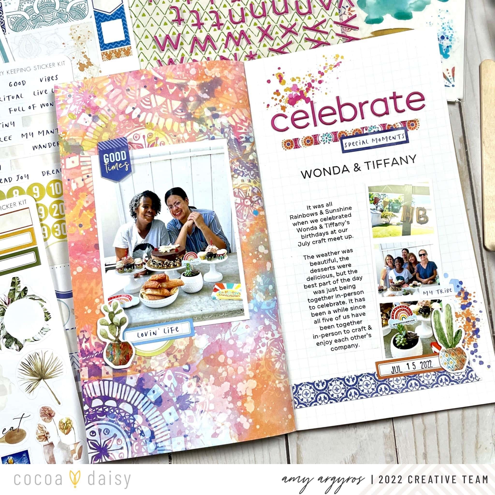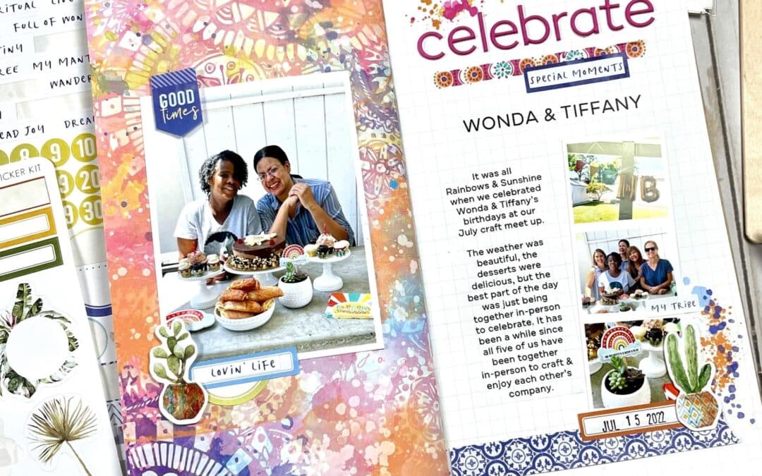 When I am creating a layout or working on any paper crafting project using Cocoa Daisy products, I love to select products from several different kits. This month’s Spice Market Collection didn’t disappoint! The collection had so many amazing items to choose from…it was difficult to select just three! To get the process started, I needed to decide on what story I wanted to tell. My craft group recently got together to celebrate July birthdays. our whole group was together in-person for the first time in over a year! I thought it would be a great day to document. I then determined my project size – TN layouts are always a great way to document smaller stories. I selected a page in the Spice Market Simple Dori from the Spice Market Traveler’s Notebook Memory Keeping Kit for the base of my layout. Picking three products became fairly easy from there – the Spice Market Traveler’s Notebook Memory Keeping Kit rub-ons, stickers from the Spice Market Memory Keeping Sticker Kit, and puffy alphas from the Spice Market Modern Memory Keeping Kit.