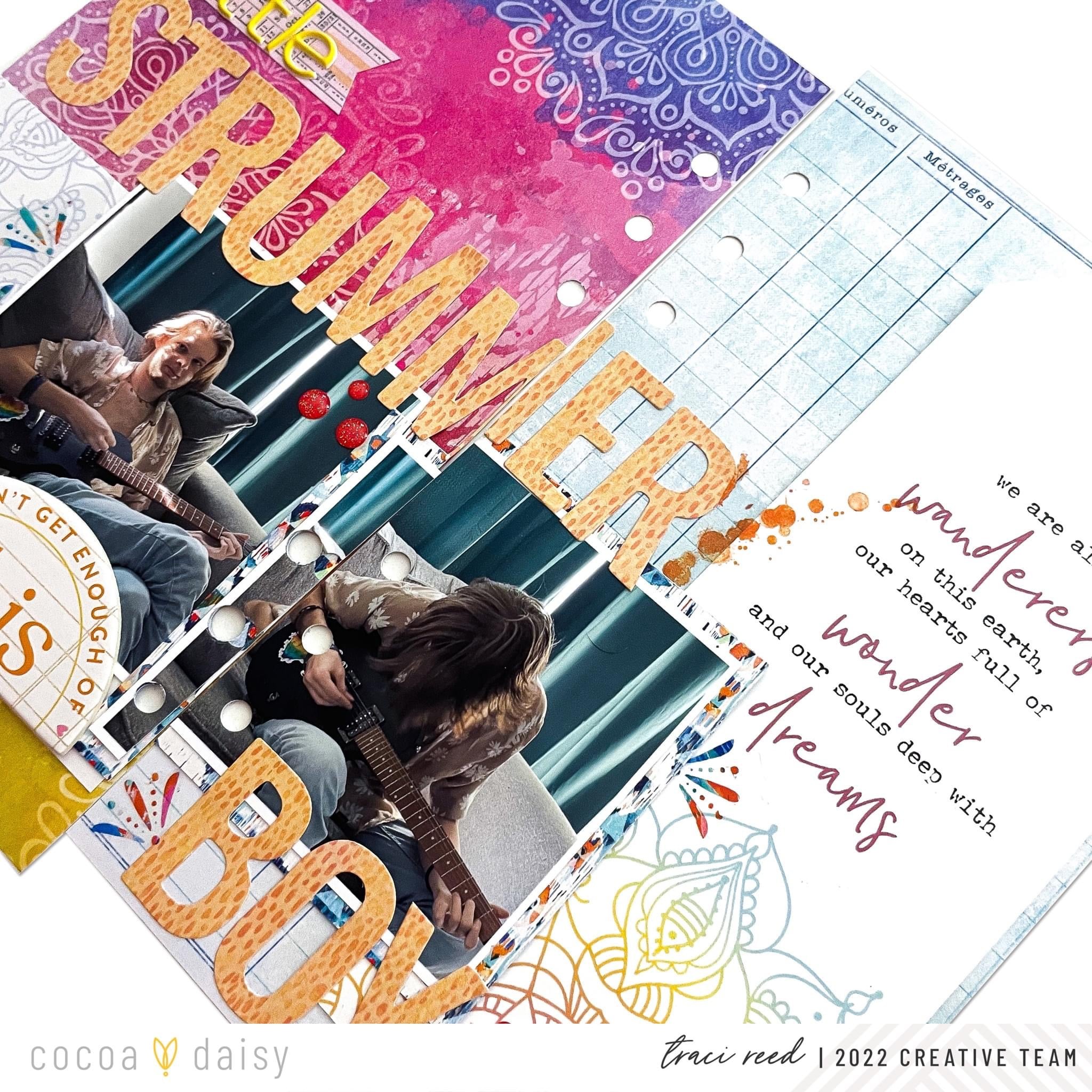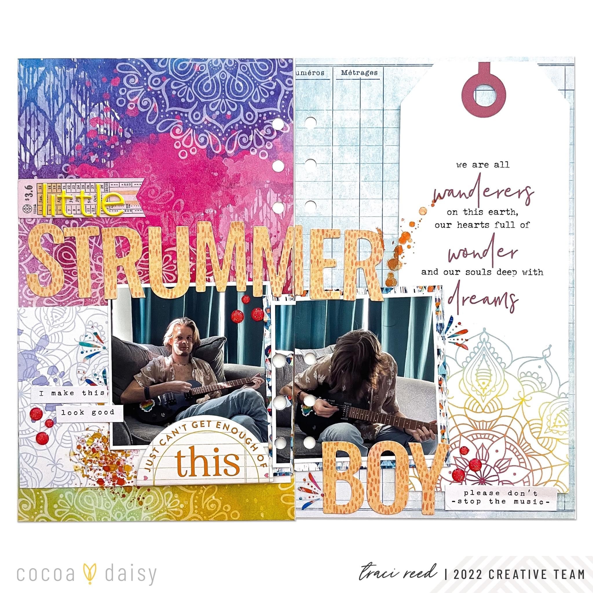 I used the printed mandalas on the paper, journal card, and tag to frame my photos and then built my layout from there!