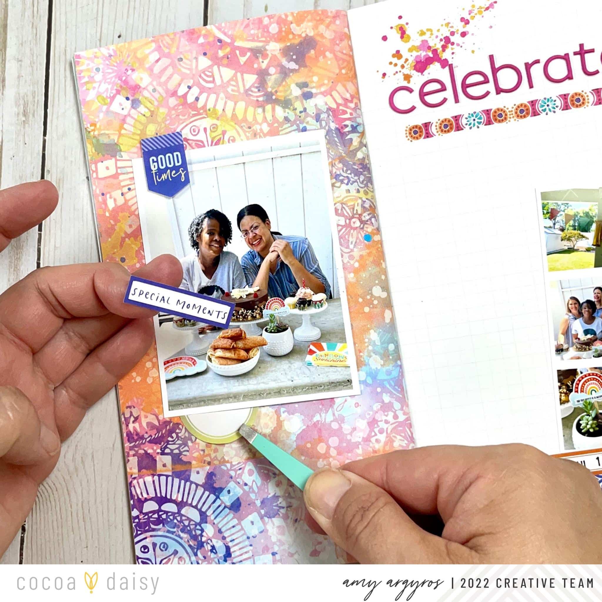 Since I was limiting myself to just three products, I only had one option. My solution had to come from the Spice Market Memory Keeping Sticker Kit. Thankfully there are so many stickers in the kit I was able to find just the ticket…or should I say label. I decided to move the label with the “SPECIAL MOMENTS” phrase I had placed on my left page over to hide the missing rub-on. I then selected a new light blue label and added the “LOVIN’ LIFE” phrase sticker in to fill in. It’s not quite as simple a layout as I had wanted, but I managed to make it all work out and document our day!
