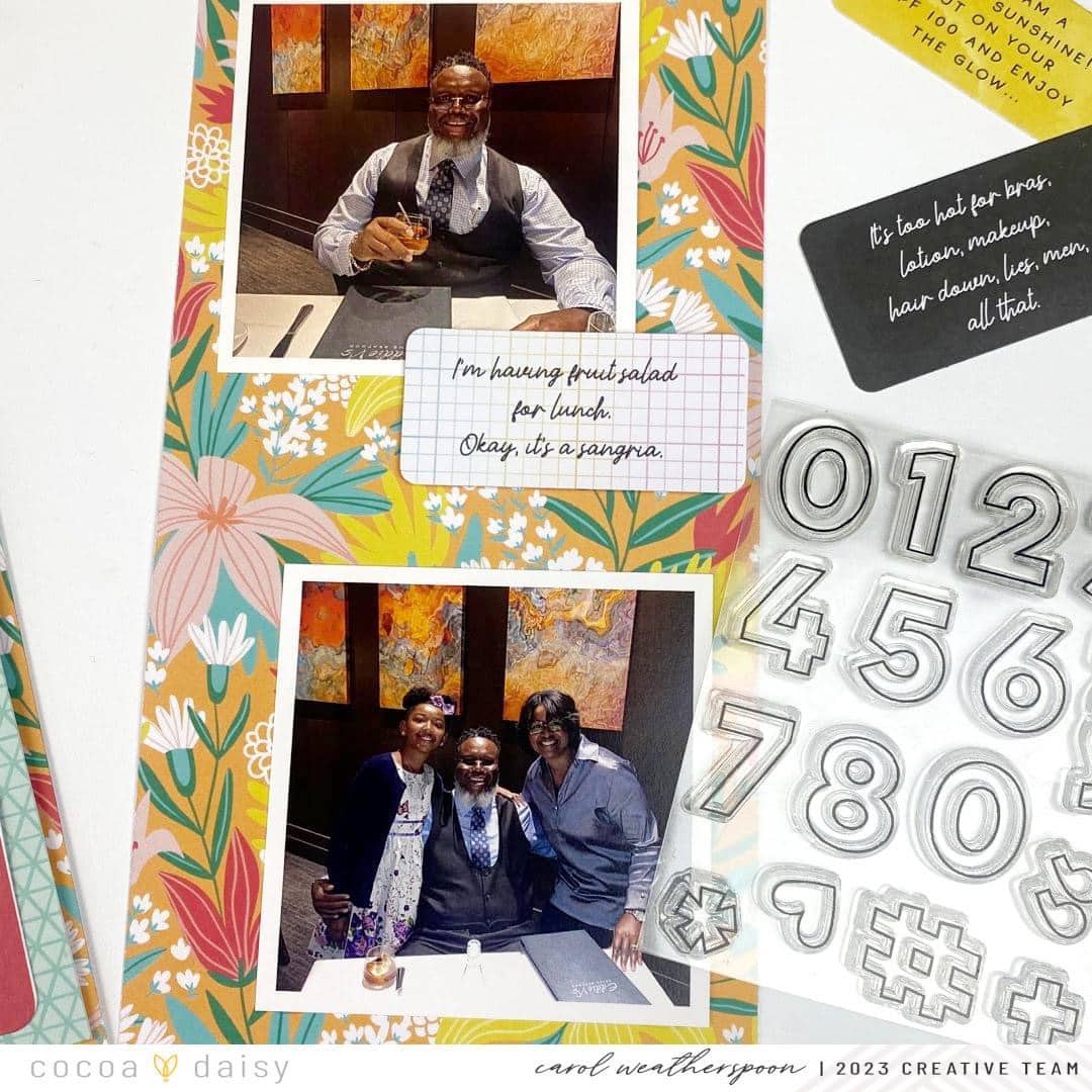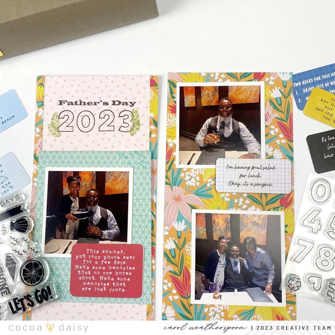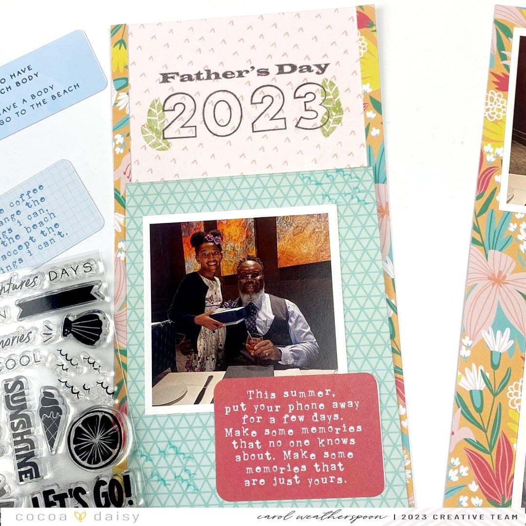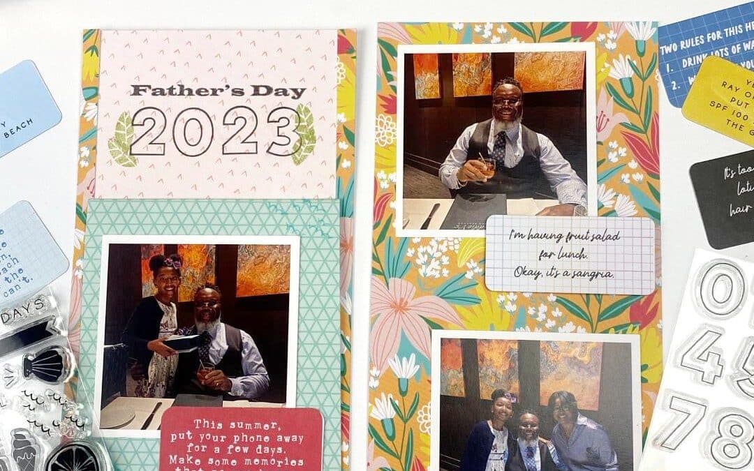 For the left side of my spread, I printed the words Father’s Day using my printer, then I added the year 2023 using those awesome number stamps from the Summer Vibes Modern Memory Keeping Kit. I absolutely love the outline of the numbers! I also used the leaf stamp to add a little interest to my title. This helps ground the numbers and keep them from “floating” on the page.