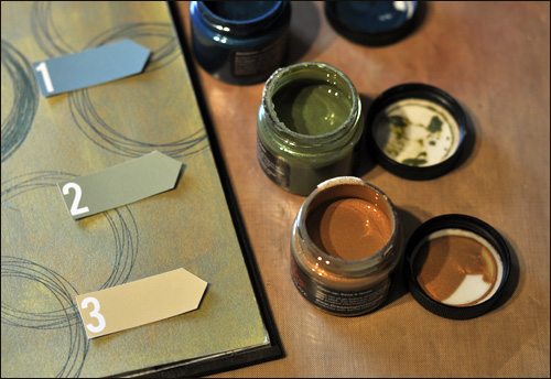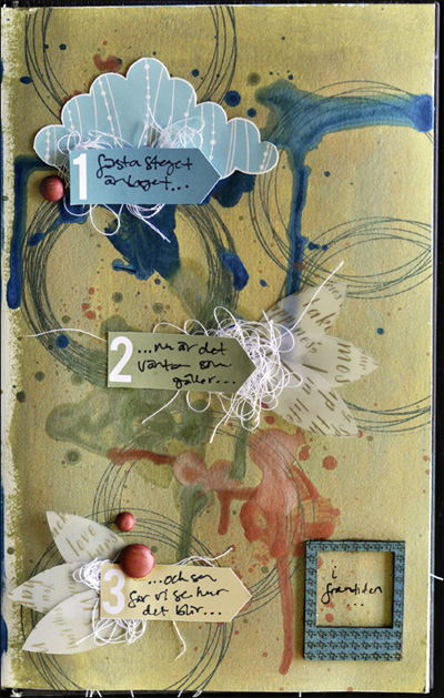 My third page started out with some stamping, using an older Cocoa Daisy stamp, and I then covered the entire page with the Moss Green Silks paint. I used the April printables and cut out the arrows with numbers.