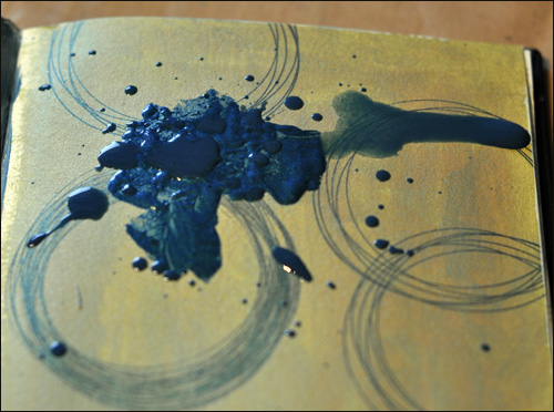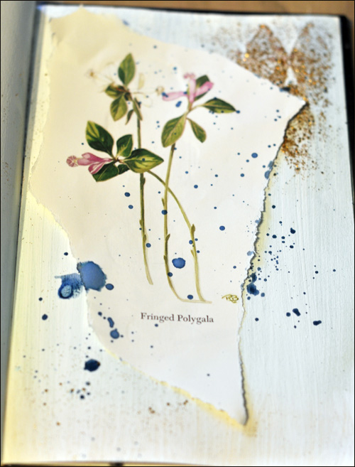 I then tore a piece of one of the book pages that came with the Project Art kit. I just adore the pink flower. I glued down my paper, not adding glue all the way to the edges, and I then splattered some of the Bolivian Blue (diluted with some water) on top of it all.