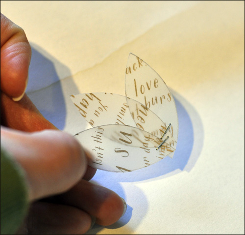 I then used some cut out vellum leaves (using the stencil as a template) and stapeled three of them together.