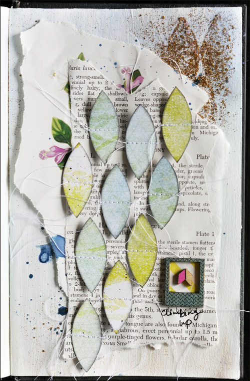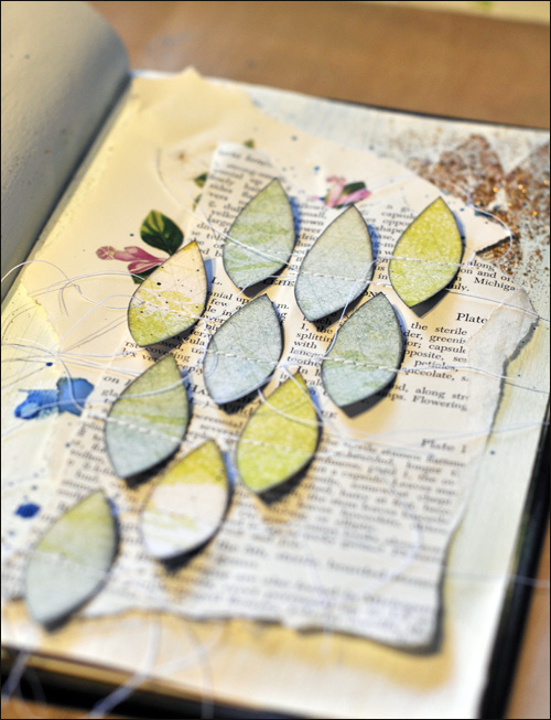 I used the stencil to trace “leaves” onto a piece of patterned paper from the patterned paper add on. I cut the leaves out and then used my sewing machine to attach them to another piece of one of the book pages.