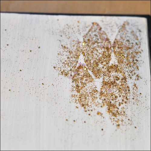 For my next page I started out using the gold glitter again. I used the stencil from the Project Art kit and applied matte medium to my page. I added the glitter and then brushed some more matte medium on top, to seal the glitter. The glitter spread some during this second application of medium, but I don’t really mind.