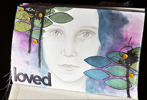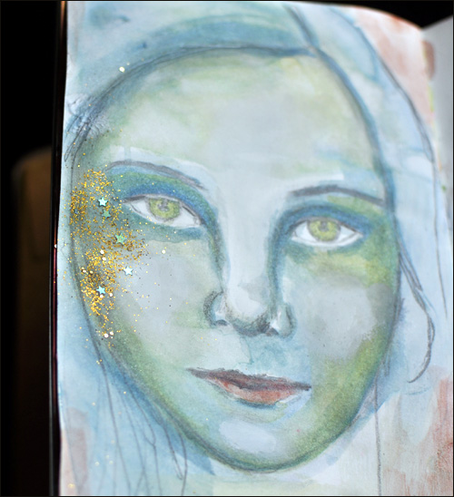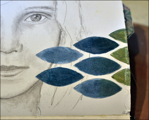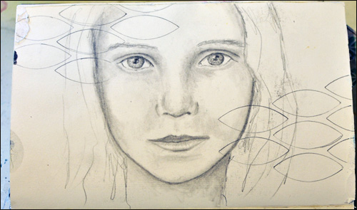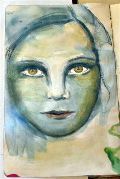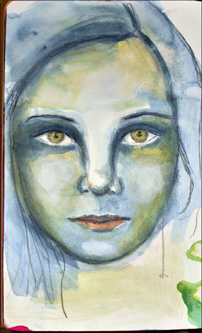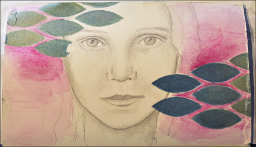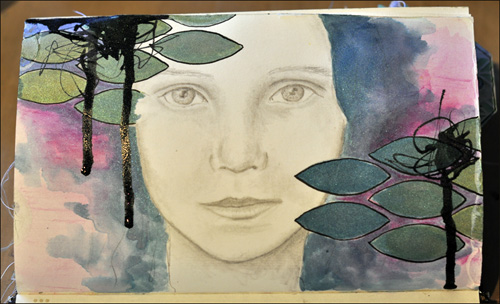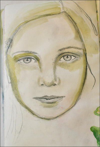 Since I have been practicing drawing portraits in an online class with Misty Mawn, I couldn’t resist playing with drawn portraits also in my journal. My first page started out with a pencil drawing. I’ve been using a photo of one of my daughters as a reference for several drawings lately, but the goal in this case wasn’t to achieve perfect likeness. On the contrary, I used the photo as a starting point, but then stopped looking at the photo and let the drawing take it’s own direction.