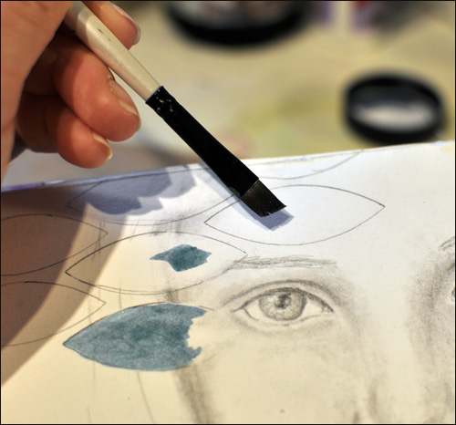 On top of the Inktense, I added diluted Bolivian Blue. I also used a pen to outline the shapes.