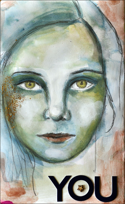 I added some white gesso to bring forward the lightest part of the face. I used Fire Opal around the edges of my page and I added some of the fantastic gold glitter from the main kit, using matte medium. I also used the chipboard letters from the main kit and the wooden star from the DITL kit.