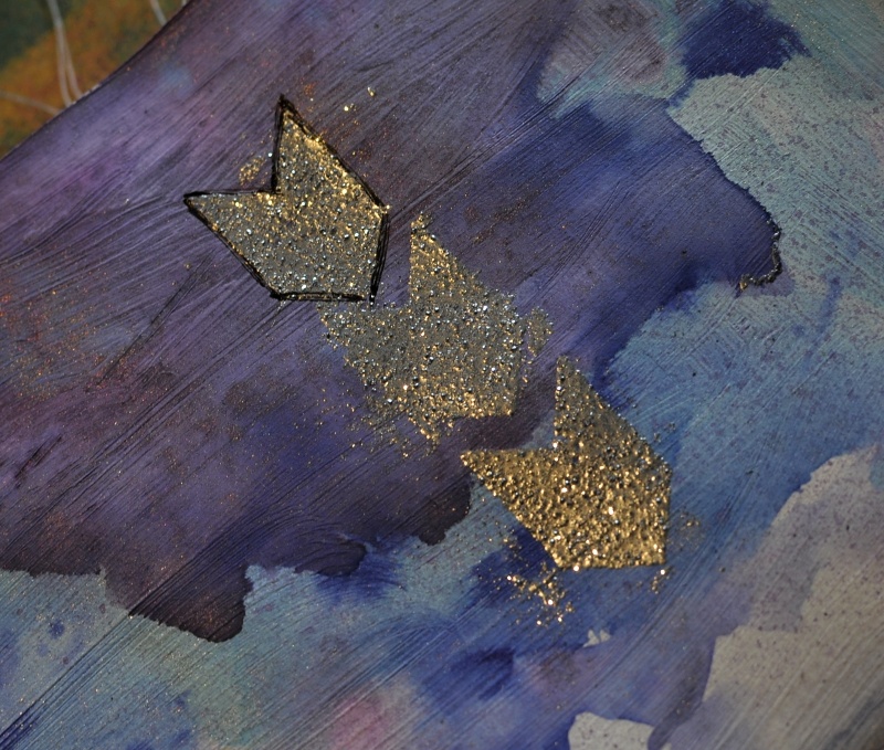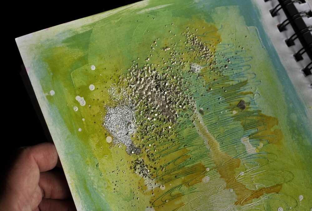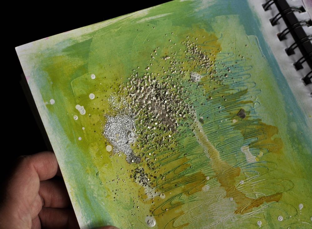 That is what I did with my first two examples. I had a page with gesso and some acrylic paint on, and I added some mist and both embossing powders to parts of the wet mist. I also sprinkled some of the glass glitter on top of the powders. You can repeat the heating and adding of powders, as many times as you wish! To avoid blowing the elements off the page, you can heat under your project, instead of from above.