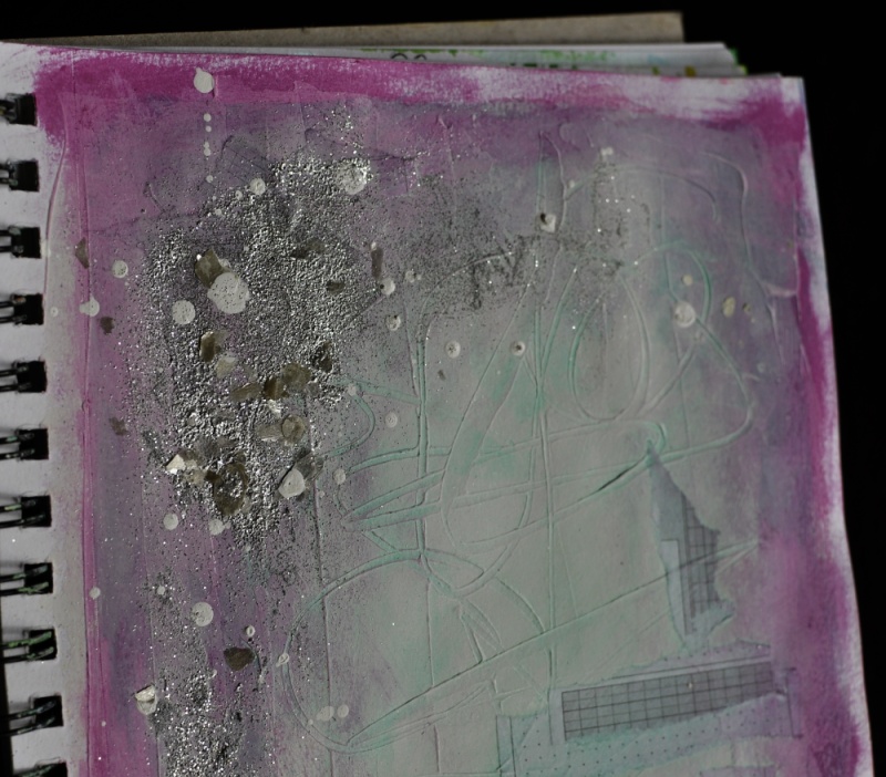 Also for this page I had a background already started, with gesso, some collaged paper bits and acrylic paint. I added more paint, the embossing powders, mica fragments and some drips of white acrylic ink.