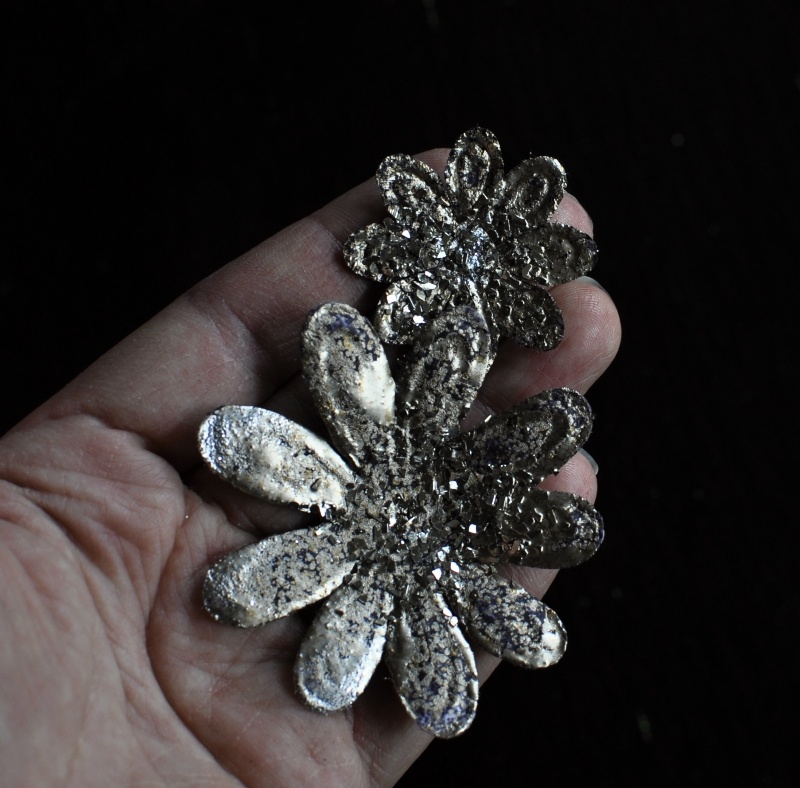 I used the ink pad when embossing the flowers. Here are a couple of flowers where I used the Aged Silver embossing powder and Silver glass glitter.