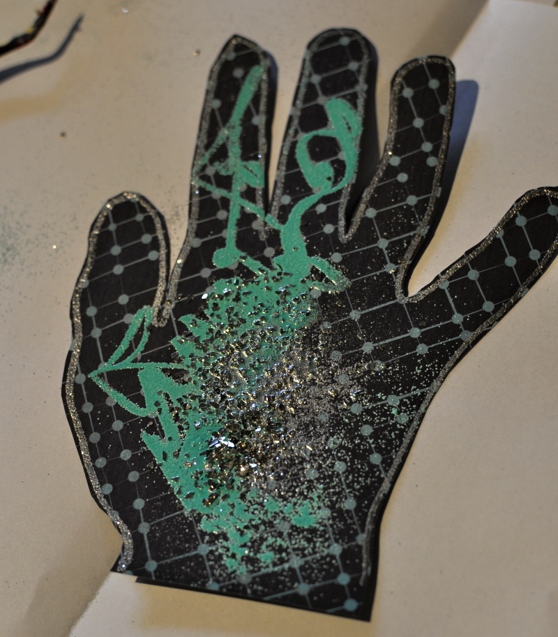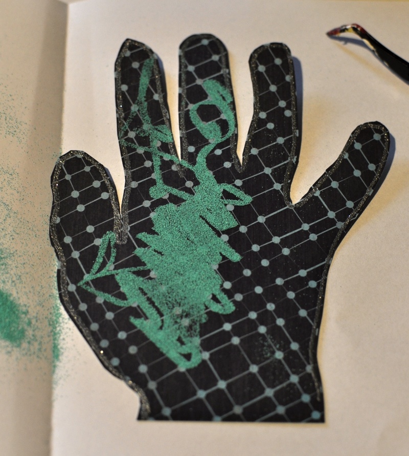 I used the pen to outline my daughters hand. I embossed the line and cut the hand out. I then used the pen again, for some messy drawing inside the hand and then took one of my Zing embossing powders out (aqua).