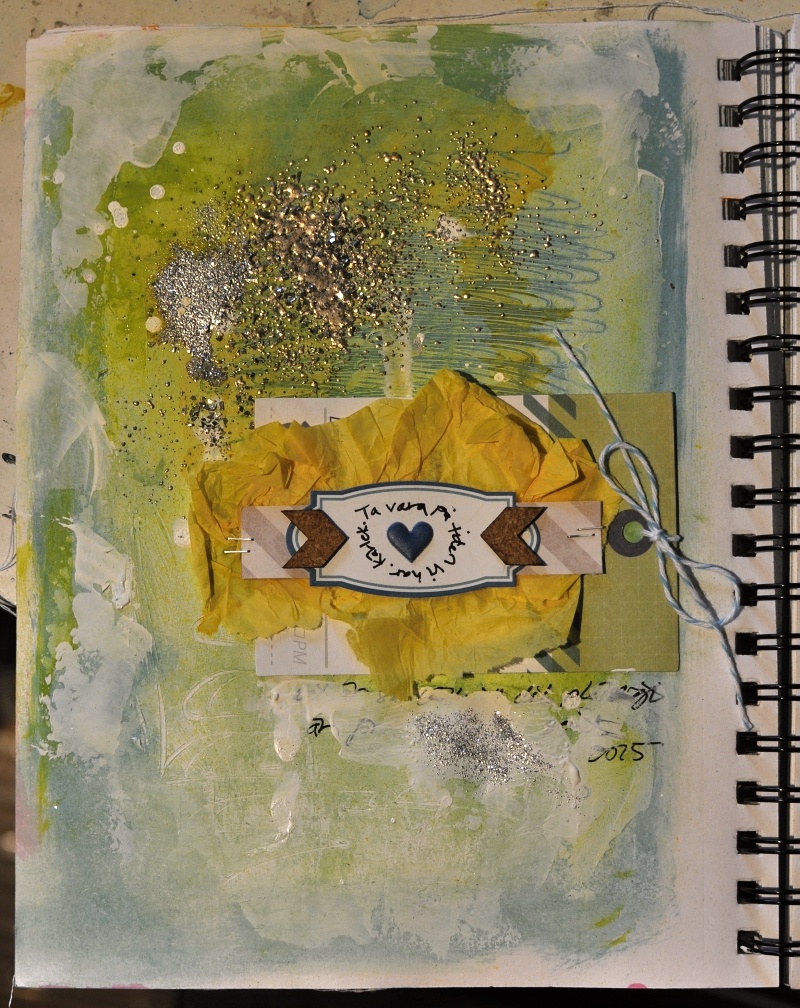 I finished the first page by layering some items from the June main kit, plus some of the gorgeous yellow tissue paper. I decided to cover some of my journaling up with gesso and I added a bit more of the silver tinsel embossing powder into the wet gesso.