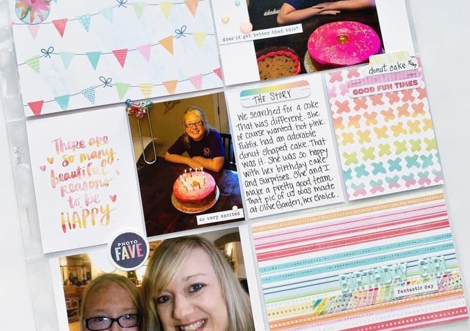 “Sometimes a project needs a culmination of different kits in order to be completed. This layout is one of those projects. I had things I actually kept back from the April kits knowing I had pics of my daughter and her hot pink, frosted donut cake that would need those items.”
