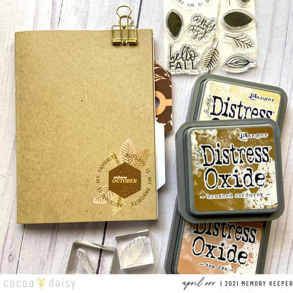 The Umber & Gold Memory Keeping Sticker Kit is fun to draw from, too, and it helped me create my title and reinforce my theme, as did the stamps from the Umber & Gold Traveler’s Notebook Memory Keeping Kit, especially the circular “autumn is my favorite.”