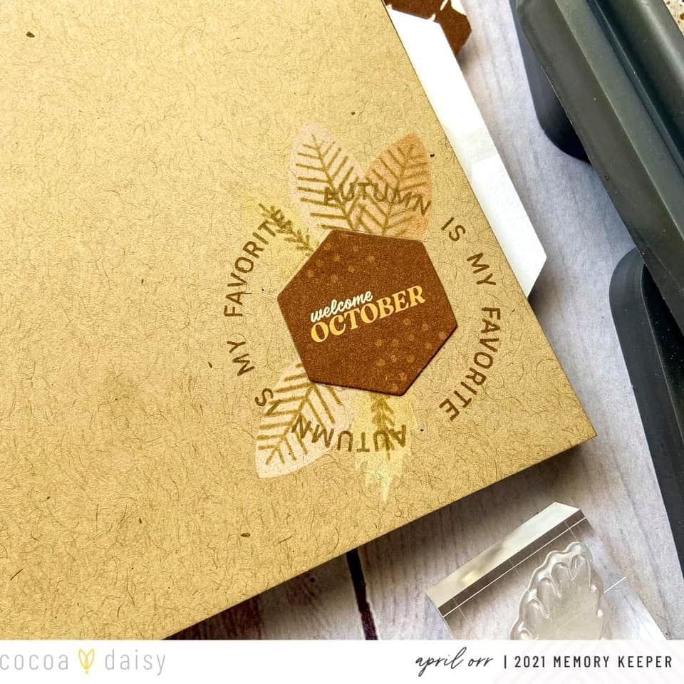 I traced the small hexagon sticker and scattered the leaf stamp from the Traveler’s Notebook Memory Keeping Kit around the edge before going back with the second leaf layer stamp.