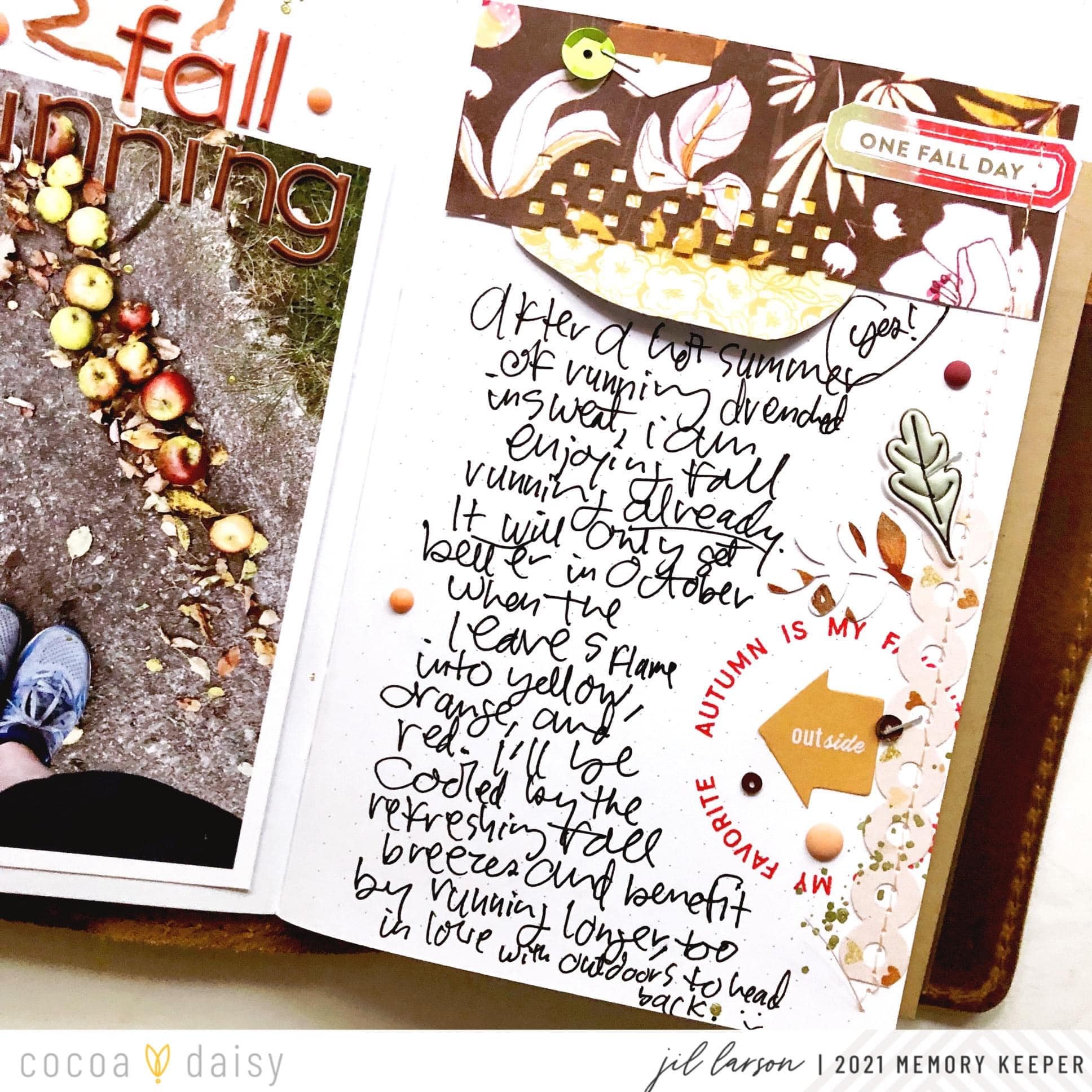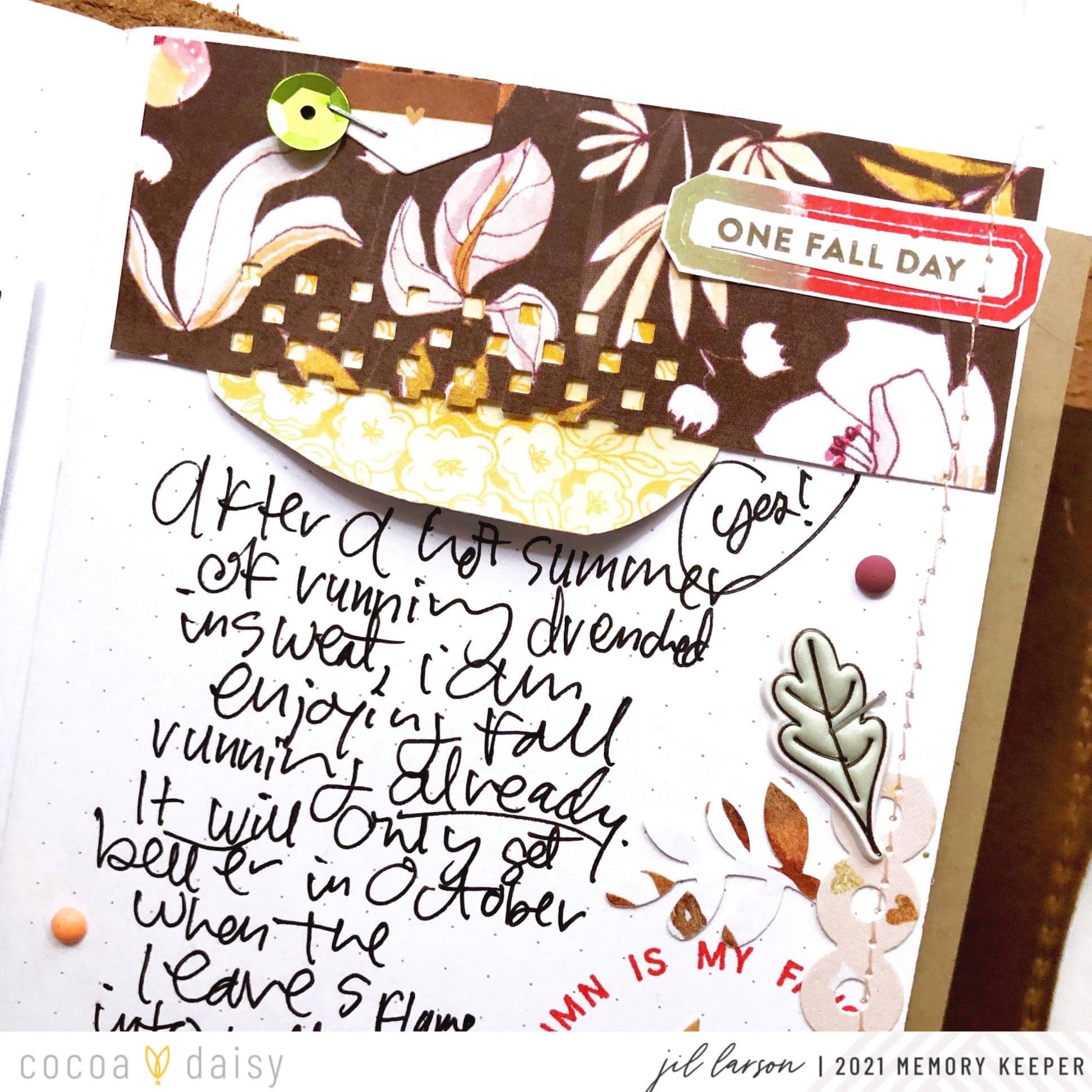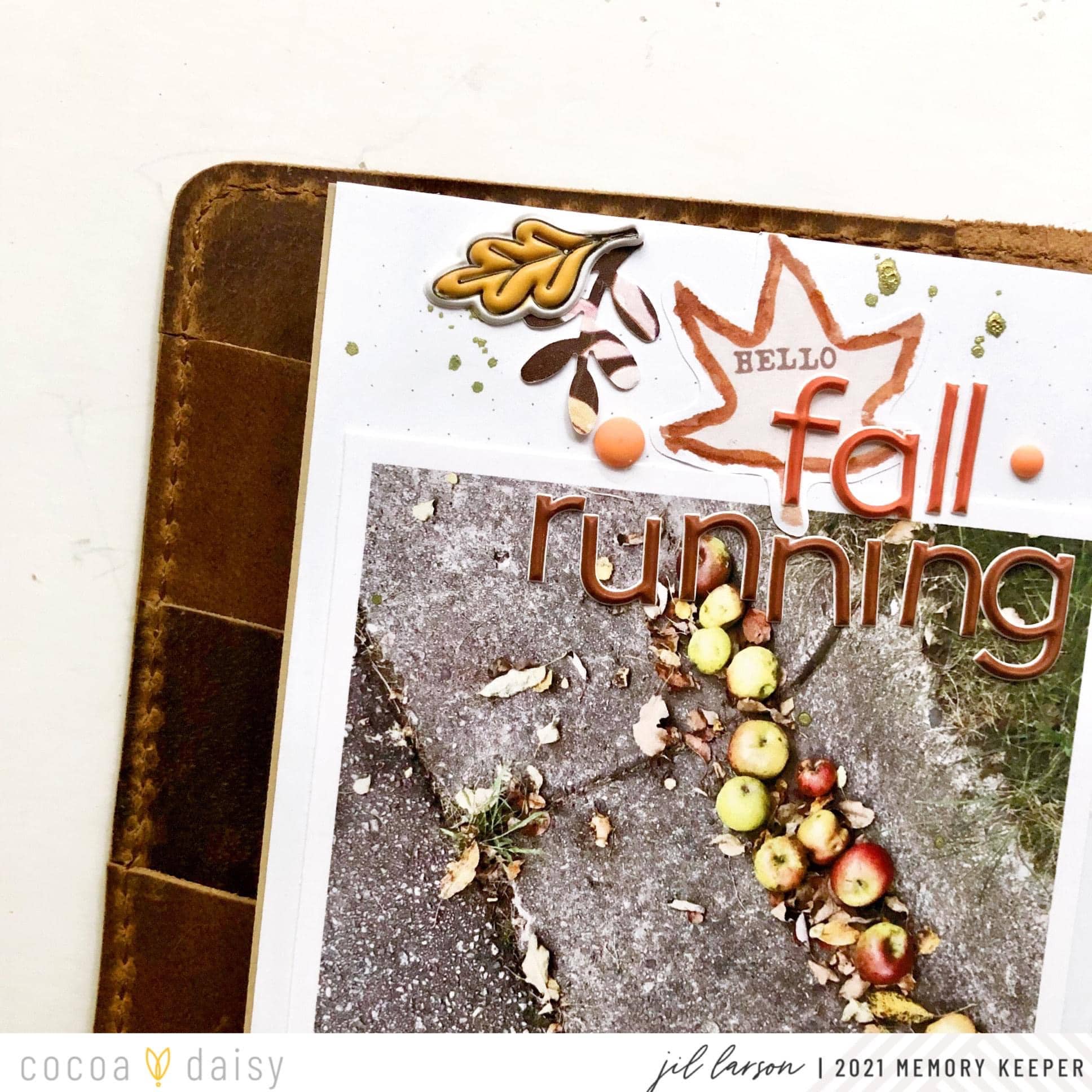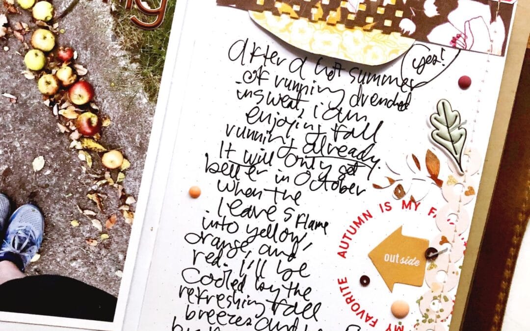 I’m working small, in an A6 notebook, and so my embellishments are small, too. Drawing on mostly Umber & Gold Collection, I also pulled in the delightful puffy stickers from Doodles & Dashes Collection to tell this story about the transition to fall running.