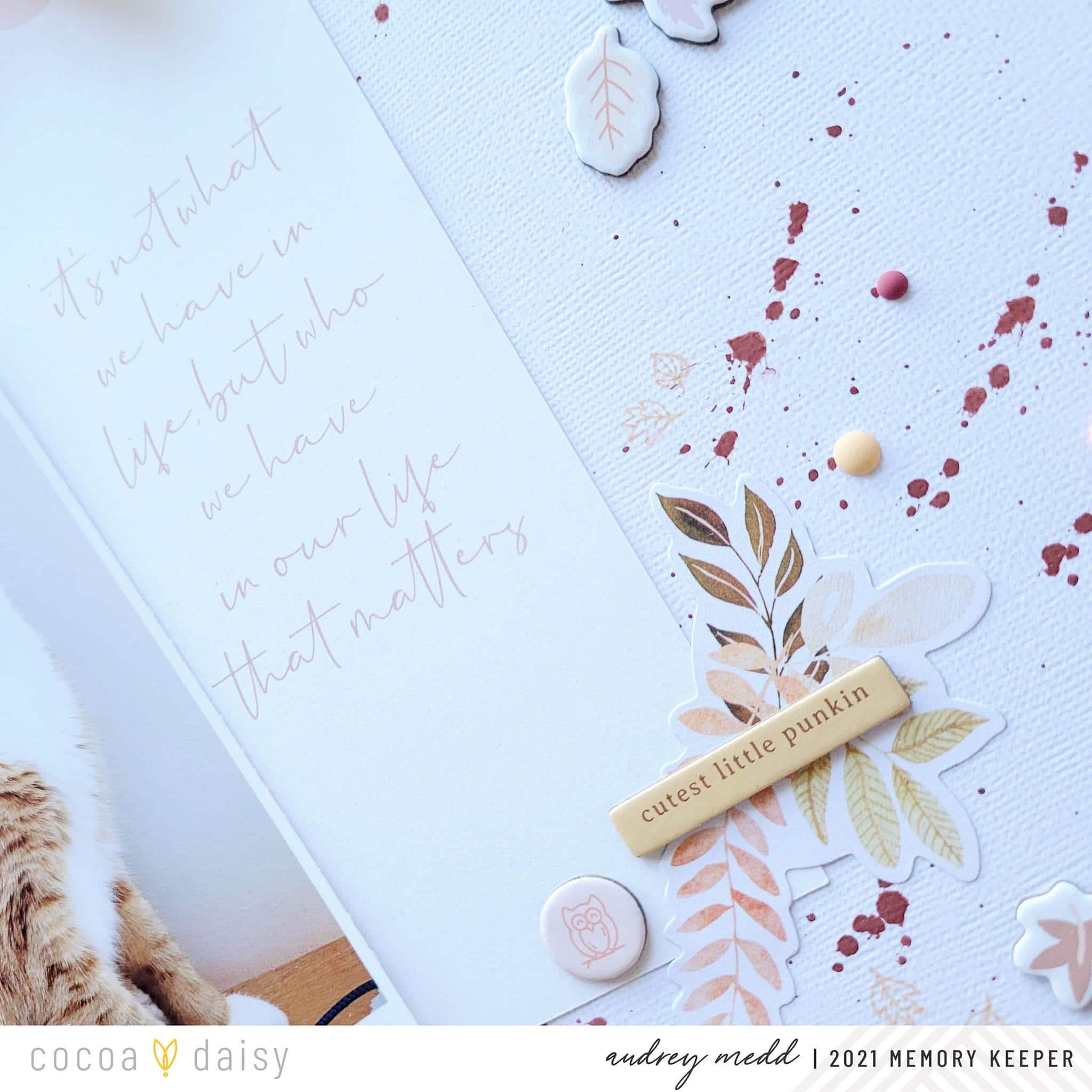 The die cuts that can be found in all the kits are filled with tiny dun details. I especially loved the soft pastel floral die cuts that just accentuate fall. I used them around this page again to pull it all together.