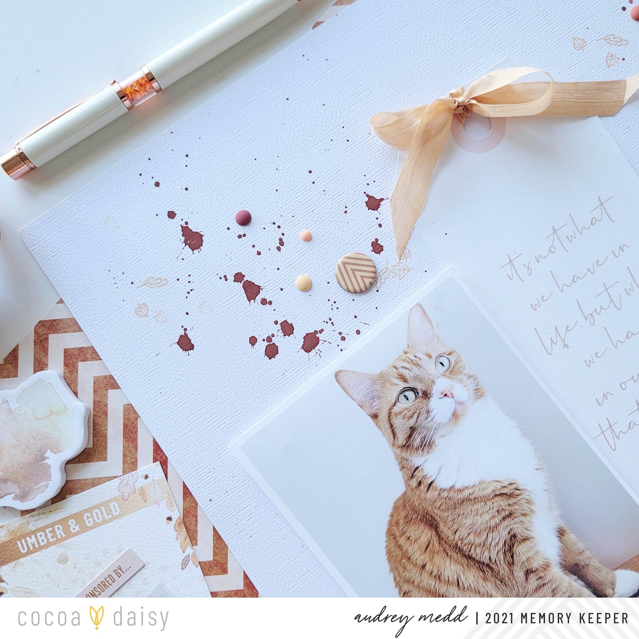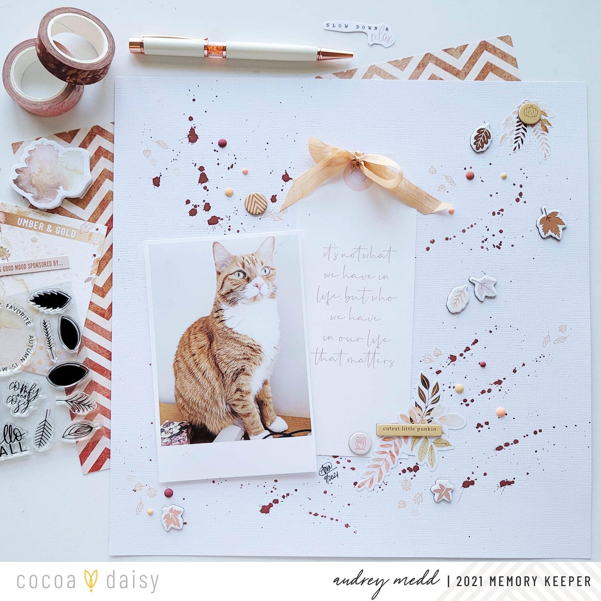 “Have you seen all of the absolutely stunning little delicate details in the Umber & Gold Collection? These little details have my heart. For this 12×12 layout of my dear Barley Jane, I used a lot of these tiny details to make a big splash. Let’s look at some of these details that I used.