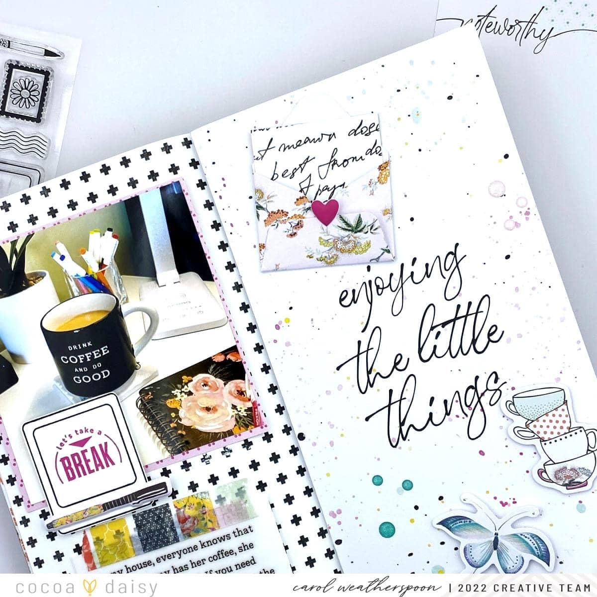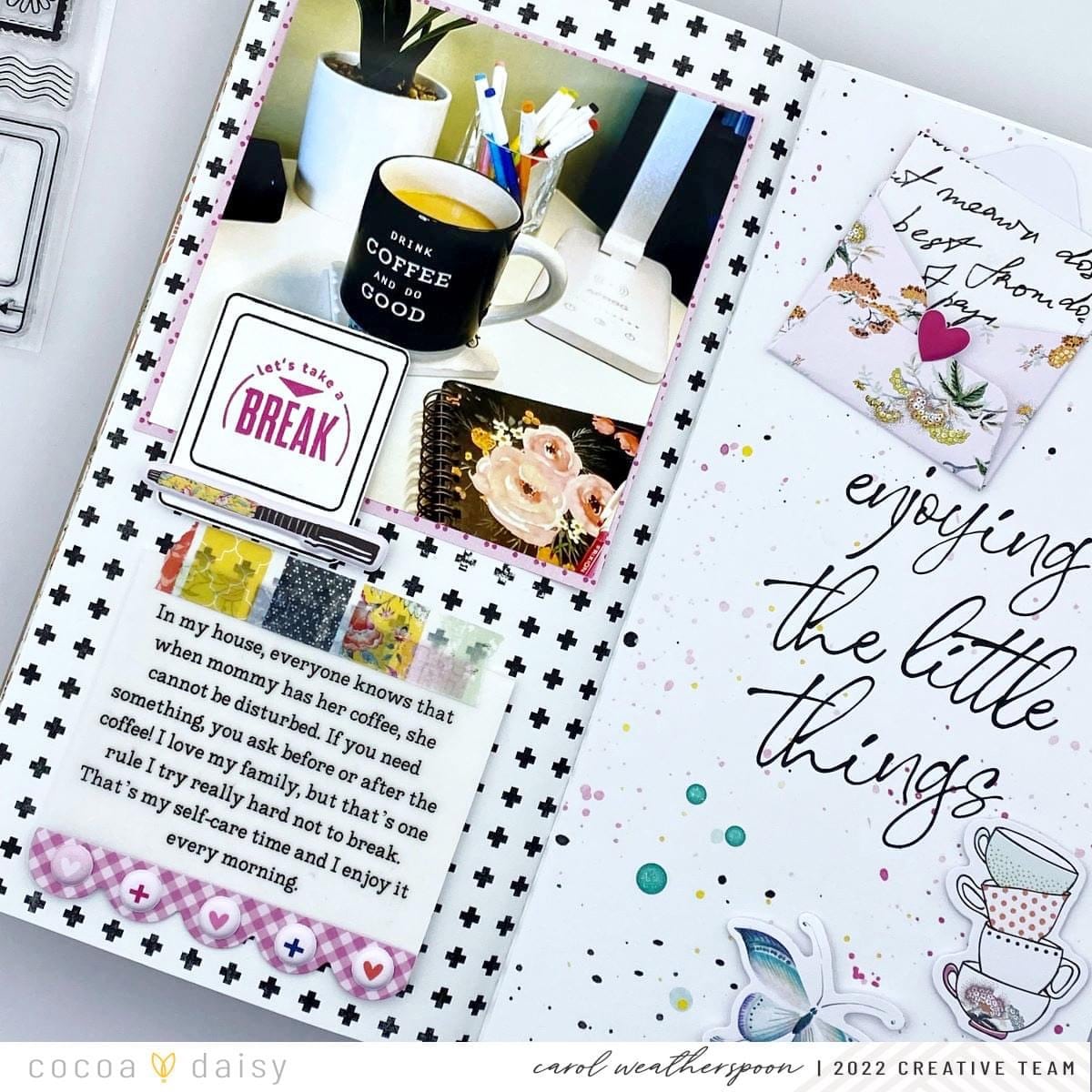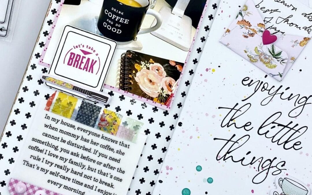 I don’t know about you, but coffee is my go-to “sip” no matter if it’s Spring, Summer, Winter, or Fall! I knew that the Afternoon Tea Collection would be perfect for this spread. I decided to really let the patterned paper take center stage along with my photo.