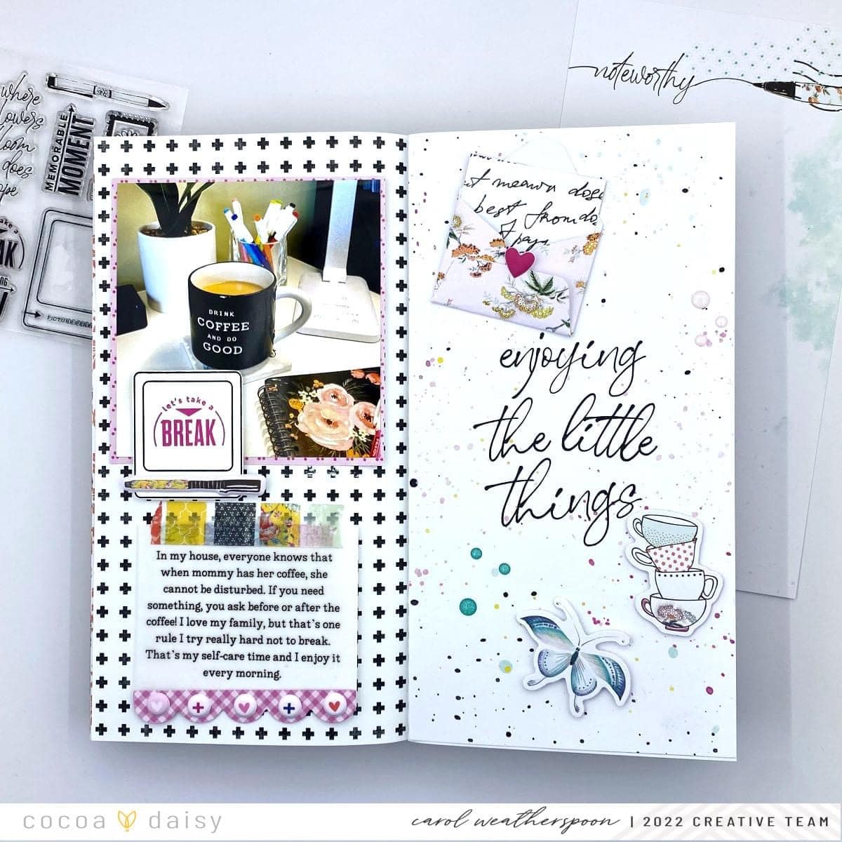 You can never go wrong with black and white so I matted my photo with a pink pattern and adhered that to the left side. I then used the stamp set from the Afternoon Tea Travelers Notebook Memory Keeping Kit to stamp that super cute picture slide and added the Let’s Take a Break sentiment inside. On the bottom of the picture slide stamp are the words Picture Perfect. Since I wasn’t including a photo there, I just adhered this adorable puffy sticker pen over top. I added my journaling underneath onto some vellum and adhered it with the beautiful washi tape included in the kit.